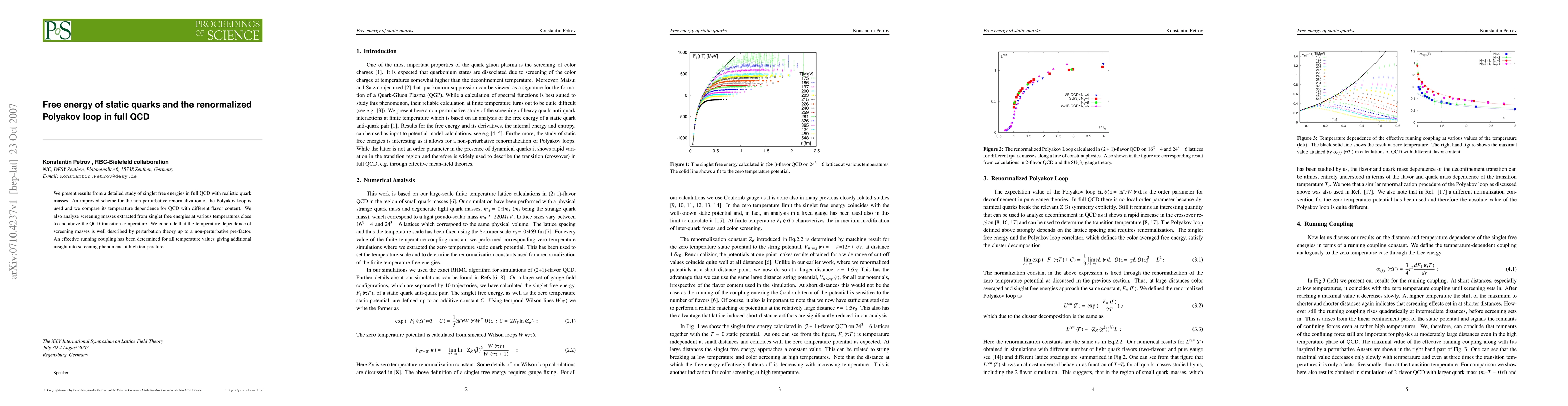 We present results from a detailed study of singlet free energies in full QCD with realistic quark masses. An improved scheme for the non-perturbative renormalization of the Polyakov loop is used and we compare its temperature dependence for QCD with different flavor content. We also analyze screening masses extracted from singlet free energies at various temperatures close to and above the QCD transition temperature. We conclude that the temperature dependence of screening masses is well described by perturbation theory up to a non-perturbative pre-factor. An effective running coupling has been determined for all temperature values giving additional insight into screening phenomena at high temperature.