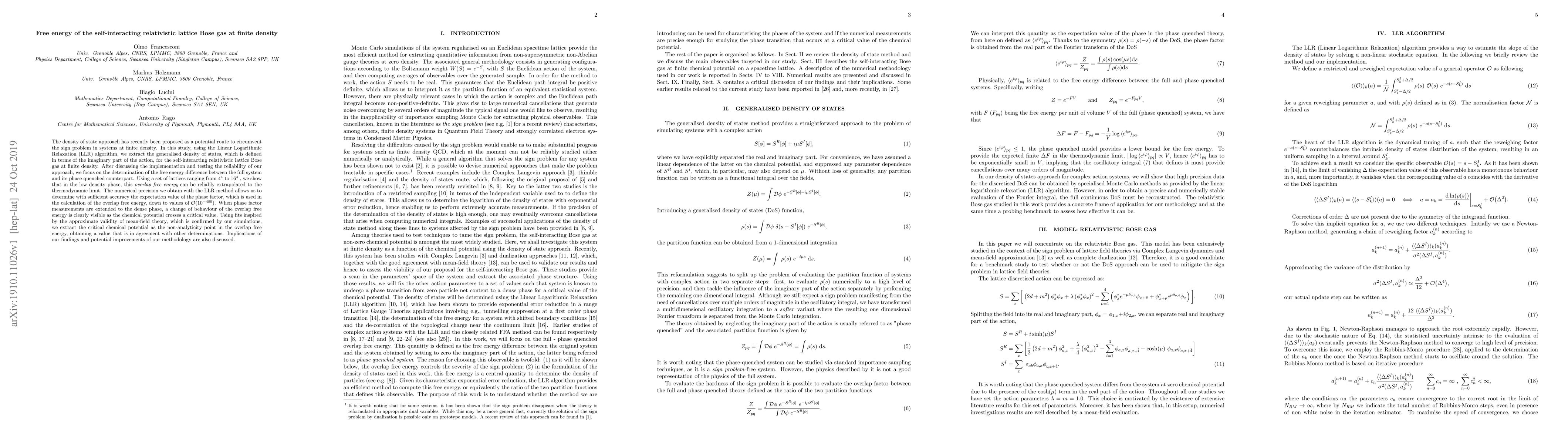 The density of state approach has recently been proposed as a potential route to circumvent the sign problem in systems at finite density. In this study, using the Linear Logarithmic Relaxation (LLR) algorithm, we extract the generalised density of states, which is defined in terms of the imaginary part of the action, for the self-interacting relativistic lattice Bose gas at finite density. After discussing the implementation and testing the reliability of our approach, we focus on the determination of the free energy difference between the full system and its phase-quenched counterpart. Using a set of lattices ranging from $4^4$ to $16^4$ , we show that in the low density phase, this overlap free energy can be reliably extrapolated to the thermodynamic limit. The numerical precision we obtain with the LLR method allows us to determine with sufficient accuracy the expectation value of the phase factor, which is used in the calculation of the overlap free energy, down to values of ${\cal O}(10^{-480})$. When phase factor measurements are extended to the dense phase, a change of behaviour of the overlap free energy is clearly visible as the chemical potential crosses a critical value. Using fits inspired by the approximate validity of mean-field theory, which is confirmed by our simulations, we extract the critical chemical potential as the non-analyticity point in the overlap free energy, obtaining a value that is in agreement with other determinations. Implications of our findings and potential improvements of our methodology are also discussed.