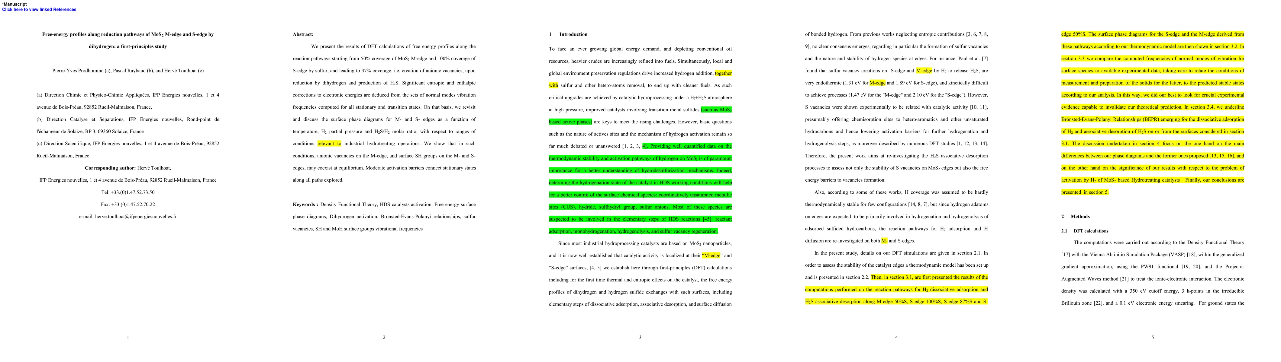 We present the results of DFT calculations of free energy profiles along the reaction pathways starting from 50% coverage of MoS2 M-edge and 100% coverage of S-edge by sulfur, and leading to 37% coverage, i.e. creation of anionic vacancies, upon reduction by dihydrogen and production of H2S. Significant entropic and enthalpic corrections to electronic energies are deduced from the sets of normal modes vibration frequencies computed for all stationary and transition states. On that basis, we revisit and discuss the surface phase diagrams for M- and S- edges as a function of temperature, H2 partial pressure and H2S/H2 molar ratio, with respect to ranges of conditions relevant to industrial hydrotreating operations. We show that in such conditions, anionic vacancies on the M-edge, and surface SH groups on the M- and S- edges, may coexist at equilibrium. Moderate activation barriers connect stationary states along all paths explored.