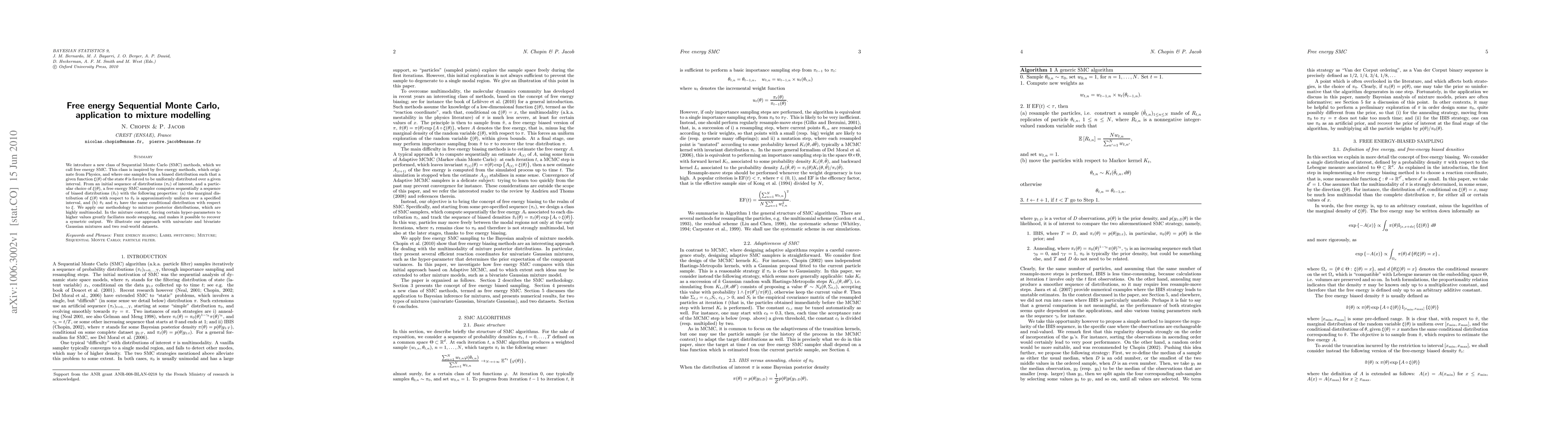 We introduce a new class of Sequential Monte Carlo (SMC) methods, which we call free energy SMC. This class is inspired by free energy methods, which originate from Physics, and where one samples from a biased distribution such that a given function $\xi(\theta)$ of the state $\theta$ is forced to be uniformly distributed over a given interval. From an initial sequence of distributions $(\pi_t)$ of interest, and a particular choice of $\xi(\theta)$, a free energy SMC sampler computes sequentially a sequence of biased distributions $(\tilde{\pi}_{t})$ with the following properties: (a) the marginal distribution of $\xi(\theta)$ with respect to $\tilde{\pi}_{t}$ is approximatively uniform over a specified interval, and (b) $\tilde{\pi}_{t}$ and $\pi_{t}$ have the same conditional distribution with respect to $\xi$. We apply our methodology to mixture posterior distributions, which are highly multimodal. In the mixture context, forcing certain hyper-parameters to higher values greatly faciliates mode swapping, and makes it possible to recover a symetric output. We illustrate our approach with univariate and bivariate Gaussian mixtures and two real-world datasets.