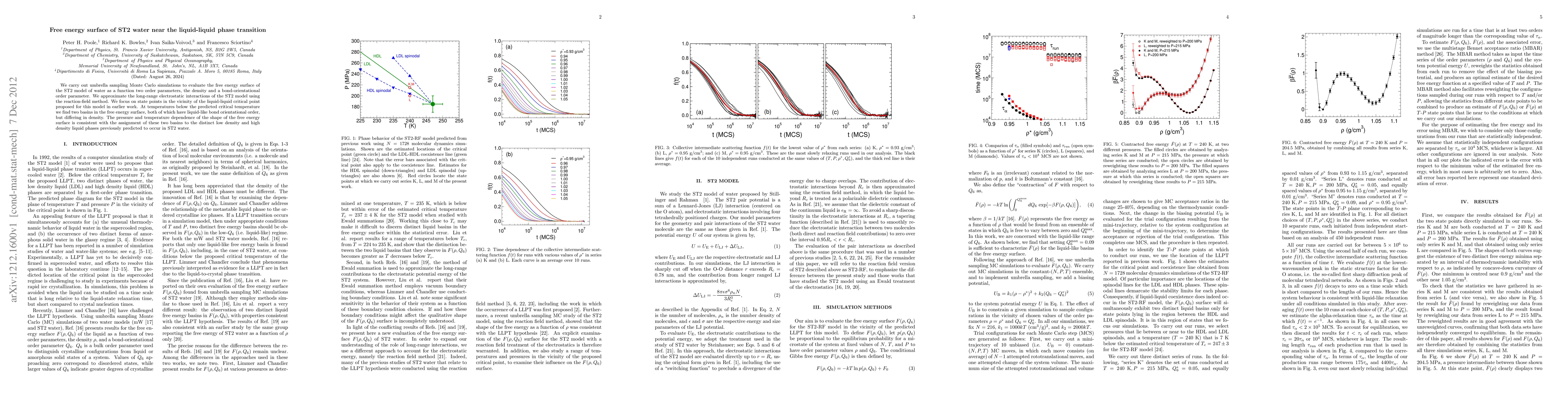 This study uses umbrella sampling Monte Carlo simulations to explore the free energy surface of ST2 water near its liquid-liquid phase transition, revealing two distinct basins corresponding to low and high density liquid phases, with similar bond orientational order but different densities. The findings align with earlier predictions of distinct liquid phases in ST2 water.