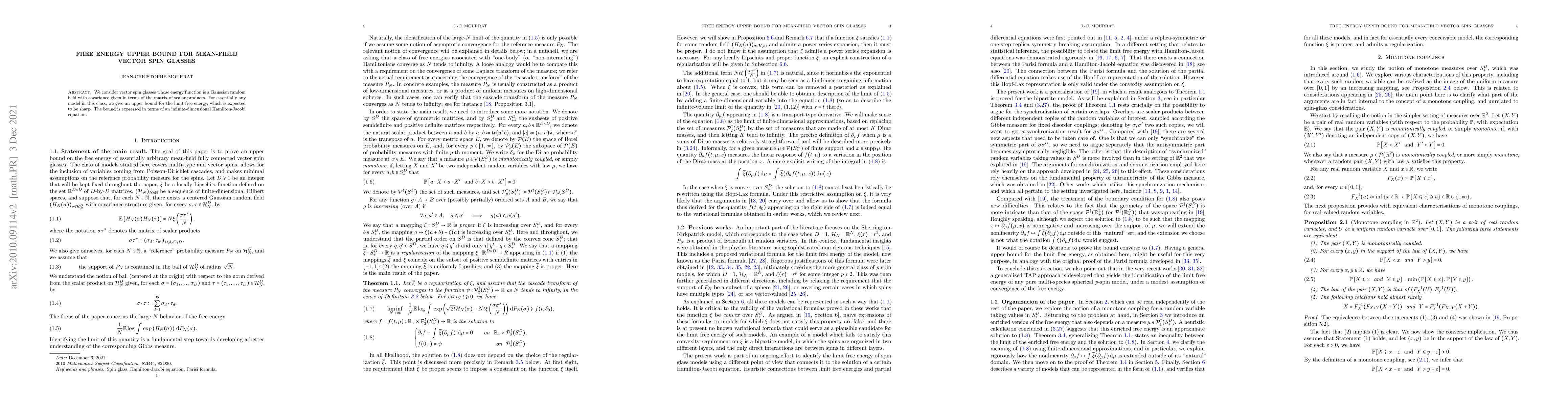 This paper provides an upper bound for the free energy of mean-field vector spin glasses, modeled by a Gaussian random field, and expresses this bound through an infinite-dimensional Hamilton-Jacobi equation, suggesting it is likely sharp.