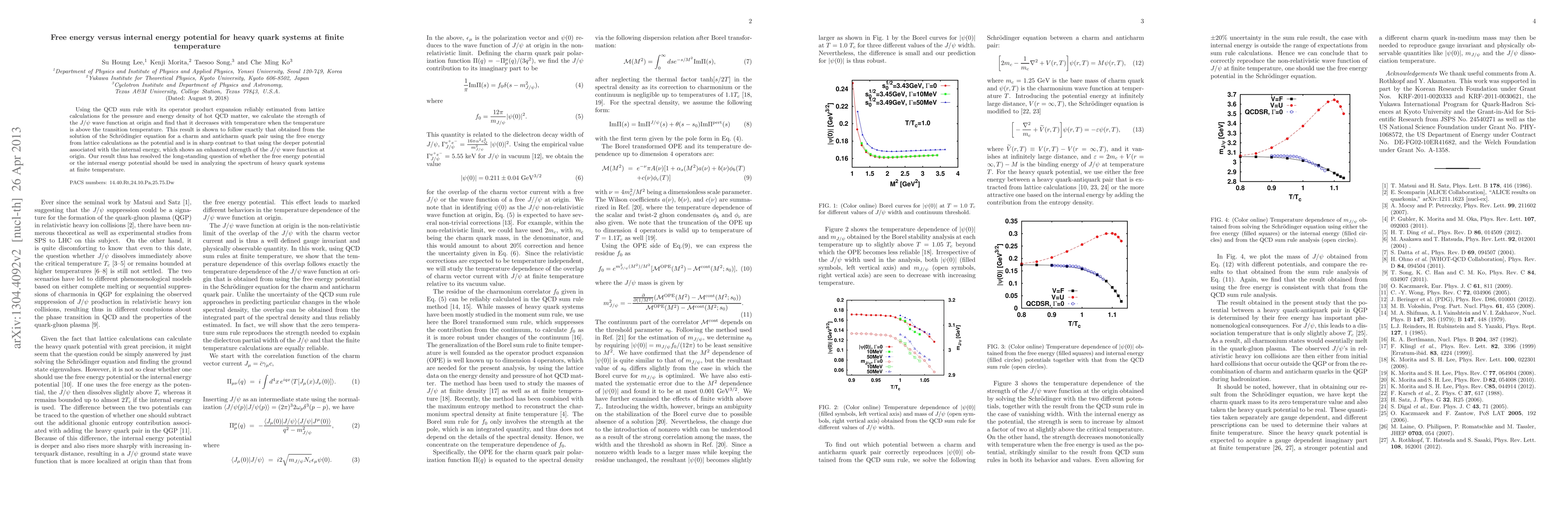 This study uses QCD sum rules and lattice calculations to show that the strength of the J/psi wave function decreases with temperature above the transition point, aligning with the free energy potential derived from lattice data. This contrasts with the internal energy potential, which suggests an enhanced wave function strength, resolving the debate over which potential is appropriate for heavy quark systems at finite temperature.