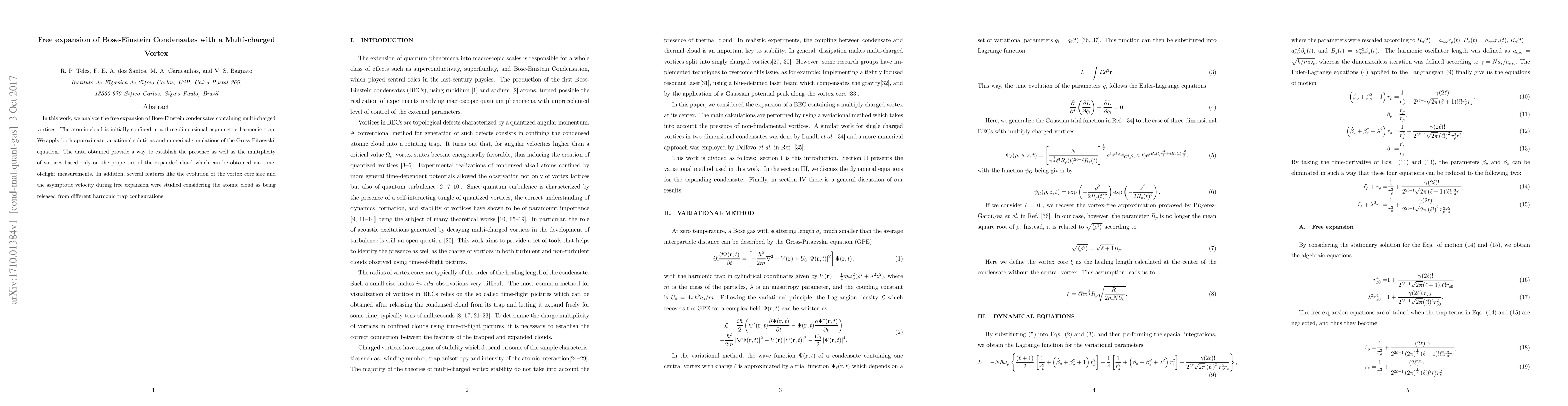 In this work, we analyze the free expansion of Bose-Einstein condensates containing multicharged vortices. The atomic cloud is initially confined in a three-dimensional asymmetric harmonic trap. We apply both approximate variational solutions and numerical simulations of the Gross-Pitaevskii equation. The data obtained provide a way to establish the presence as well as the multiplicity of vortices based only on the properties of the expanded cloud which can be obtained via time-of-flight measurements. In addition, several features such as the evolution of the vortex core size and the asymptotic velocity during free expansion were studied considering the atomic cloud as being released from different harmonic trap configurations.