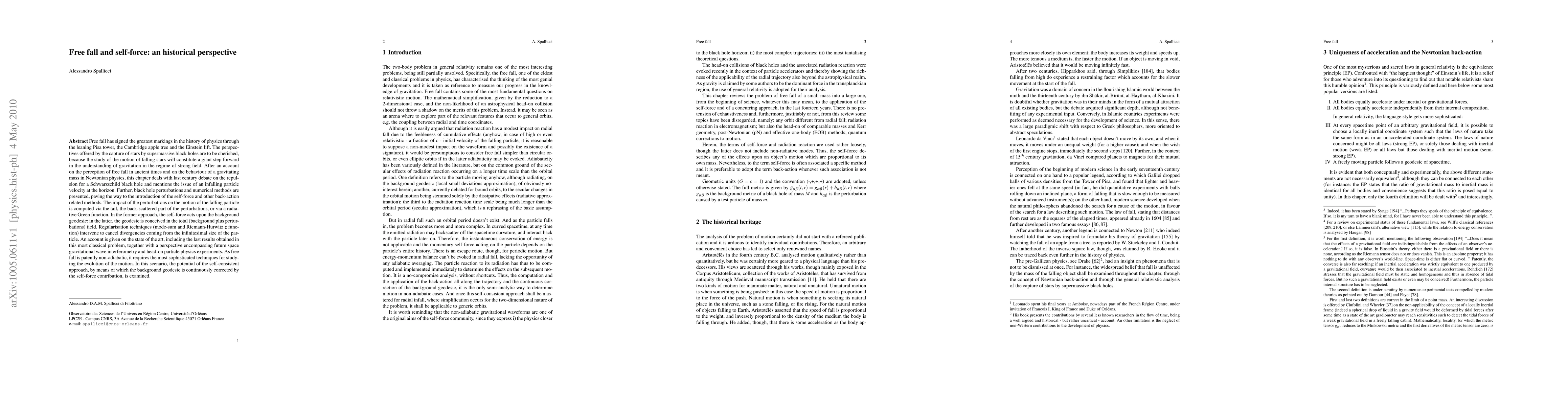Free fall has signed the greatest markings in the history of physics through the leaning Pisa tower, the Cambridge apple tree and the Einstein lift. The perspectives offered by the capture of stars by supermassive black holes are to be cherished, because the study of the motion of falling stars will constitute a giant step forward in the understanding of gravitation in the regime of strong field. After an account on the perception of free fall in ancient times and on the behaviour of a gravitating mass in Newtonian physics, this chapter deals with last century debate on the repulsion for a Schwarzschild black hole and mentions the issue of an infalling particle velocity at the horizon. Further, black hole perturbations and numerical methods are presented, paving the way to the introduction of the self-force and other back-action related methods. The impact of the perturbations on the motion of the falling particle is computed via the tail, the back-scattered part of the perturbations, or via a radiative Green function. In the former approach, the self-force acts upon the background geodesic; in the latter, the geodesic is conceived in the total (background plus perturbations) field. Regularisation techniques (mode-sum and Riemann-Hurwitz $z$ function) intervene to cancel divergencies coming from the infinitesimal size of the particle. An account is given on the state of the art, including the last results obtained in this most classical problem, together with a perspective encompassing future space gravitational wave interferometry and head-on particle physics experiments. As free fall is patently non-adiabatic, it requires the most sophisticated techniques for studying the evolution of the motion. In this scenario, the potential of the self-consistent approach, by means of which the background geodesic is continuously corrected by the self-force contribution, is examined.
