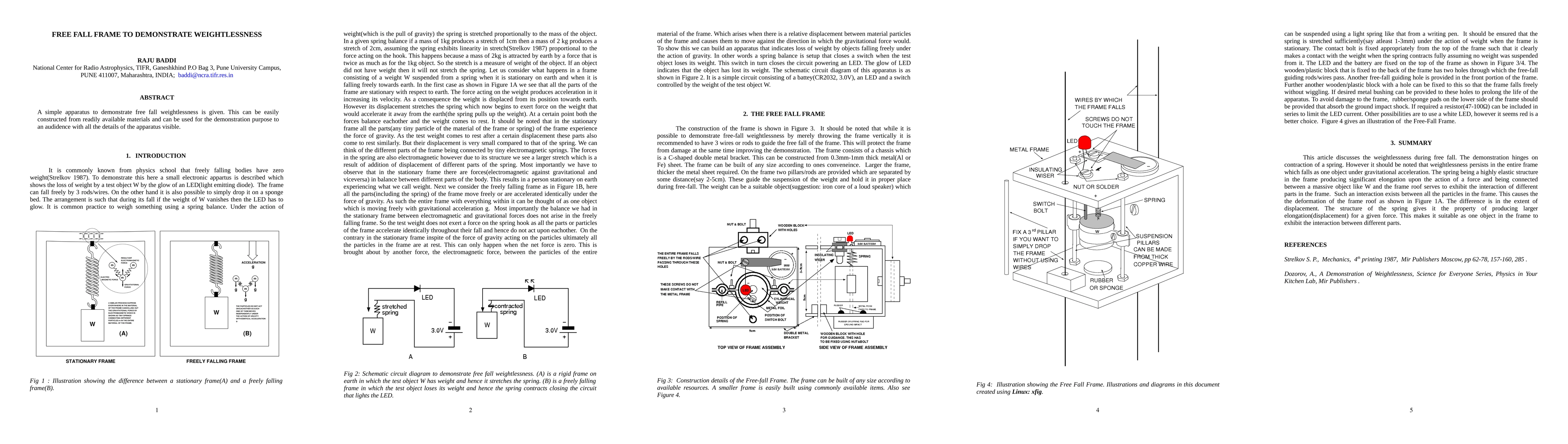 A simple apparatus to demonstrate free fall weightlessness is given. This can be easily constructed from readily available materials and can be used for the demonstration purpose to an audidence with all the details of the apparatus visible.