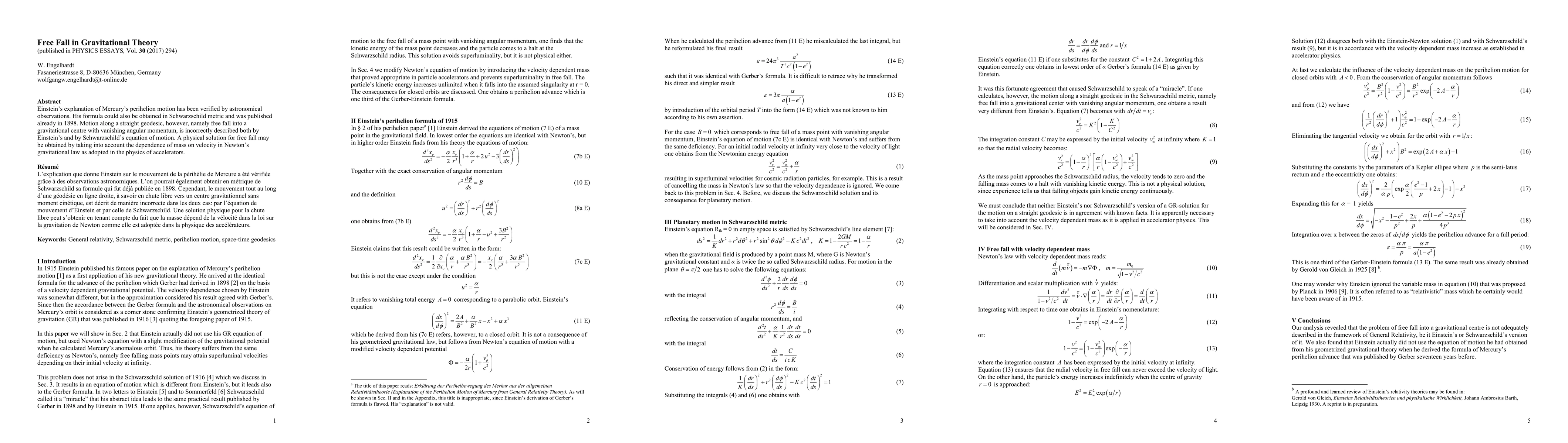 The paper critically analyzes Einstein's and Schwarzschild's descriptions of free fall in General Relativity (GR), comparing them with Newton's gravitational law and velocity-dependent mass concept from accelerator physics.