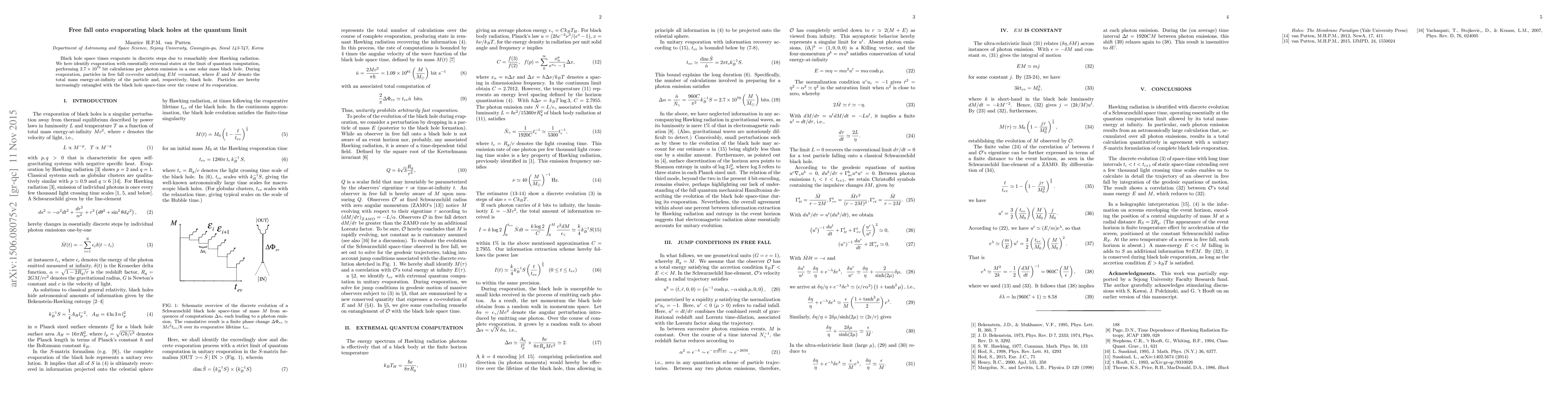Black hole space times evaporate in discrete steps due to remarkably slow Hawking radiation. We here identify evaporation with essentially extremal states at the limit of quantum computation, performing $2.7\times 10^{79}$ bit calculations per photon emission in a one solar mass black hole. During evaporation, particles in free fall co-evolve satisfying $EM=$constant, where $E$ and $M$ denote the total mass energy-at-infinity of the particle and, respectively, black hole. Particles are hereby increasingly entangled with the black hole space-time over the course of its evaporation.