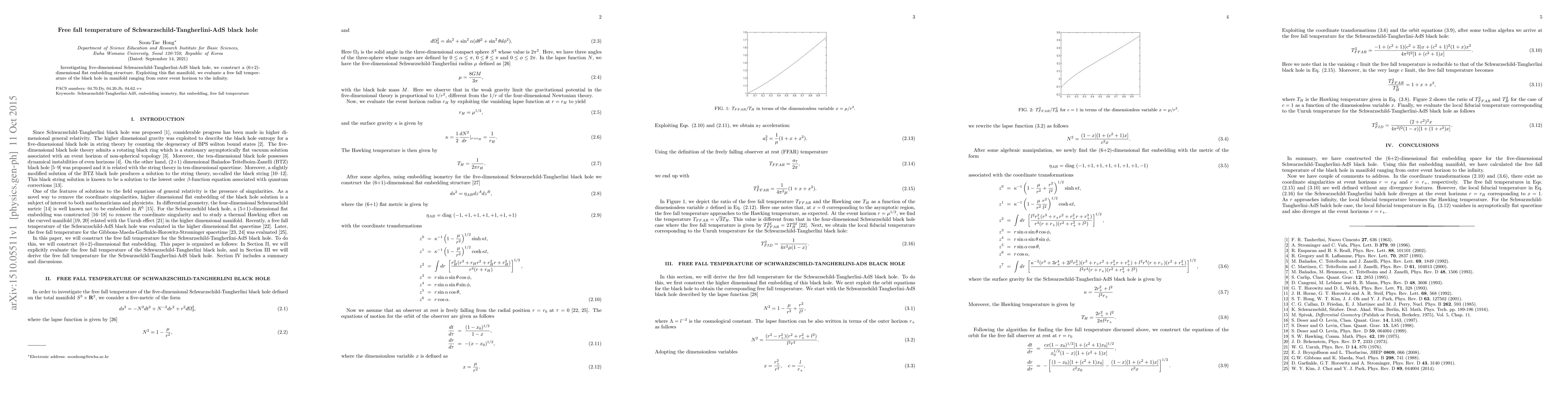 Investigating five-dimensional Schwarzschild-Tangherlini-AdS black hole, we construct a (6+2)-dimensional flat embedding structure. Exploiting this flat manifold, we evaluate a free fall temperature of the black hole in manifold ranging from outer event horizon to the infinity.