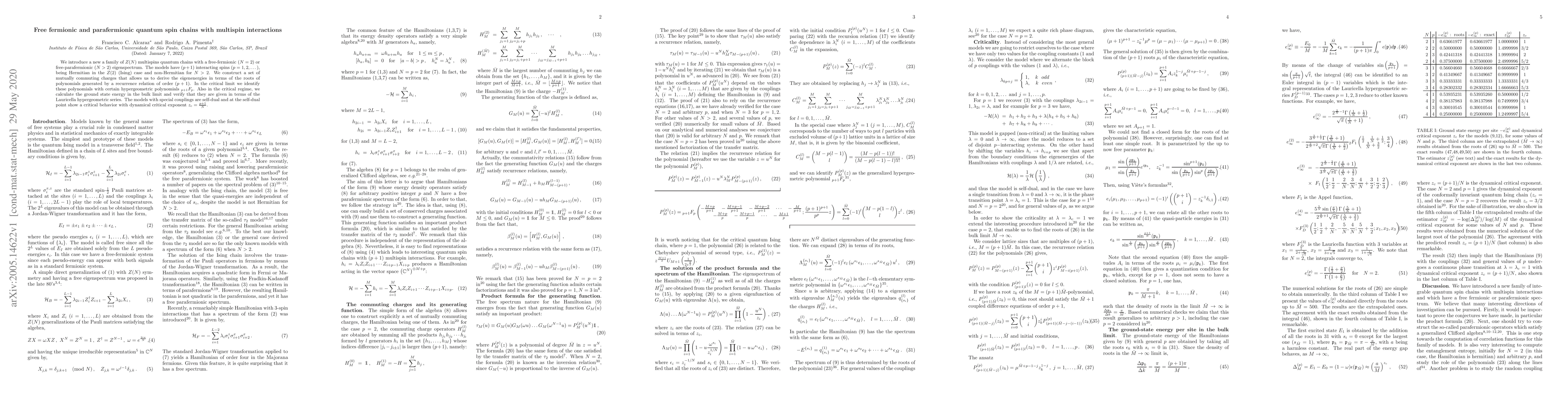 We introduce a new a family of $Z(N)$ multispins quantum chains with a free-fermionic ($N=2$) or free-parafermionic ($N>2$) eigenspectrum. The models have $(p+1)$ interacting spins ($p=1,2,\dots$), being Hermitian in the $Z(2)$ (Ising) case and non-Hermitian for $N>2$. We construct a set of mutually commuting charges that allows us to derive the eigenenergies in terms of the roots of polynomials generated by a recurrence relation of order $(p+1)$. In the critical limit we identify these polynomials with certain hypergeometric polynomials ${}_{p+1}F_p$. Also in the critical regime, we calculate the ground state energy in the bulk limit and verify that they are given in terms of the Lauricella hypergeometric series. The models with special couplings are self-dual and at the self-dual point show a critical behavior with dynamical critical exponent $z_c=\frac{p+1}{N}$.