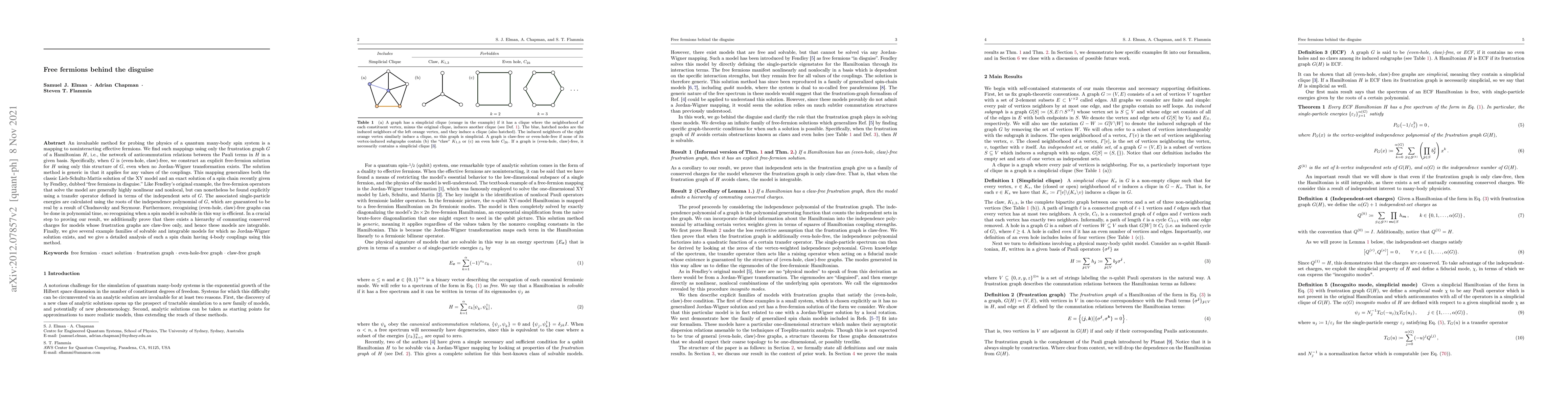 An invaluable method for probing the physics of a quantum many-body spin system is a mapping to noninteracting effective fermions. We find such mappings using only the frustration graph $G$ of a Hamiltonian $H$, i.e., the network of anticommutation relations between the Pauli terms in $H$ in a given basis. Specifically, when $G$ is (even-hole, claw)-free, we construct an explicit free-fermion solution for $H$ using only this structure of $G$, even when no Jordan-Wigner transformation exists. The solution method is generic in that it applies for any values of the couplings. This mapping generalizes both the classic Lieb-Schultz-Mattis solution of the XY model and an exact solution of a spin chain recently given by Fendley, dubbed "free fermions in disguise." Like Fendley's original example, the free-fermion operators that solve the model are generally highly nonlinear and nonlocal, but can nonetheless be found explicitly using a transfer operator defined in terms of the independent sets of $G$. The associated single-particle energies are calculated using the roots of the independence polynomial of $G$, which are guaranteed to be real by a result of Chudnovsky and Seymour. Furthermore, recognizing (even-hole, claw)-free graphs can be done in polynomial time, so recognizing when a spin model is solvable in this way is efficient. We give several example families of solvable models for which no Jordan-Wigner solution exists, and we give a detailed analysis of such a spin chain having 4-body couplings using this method.