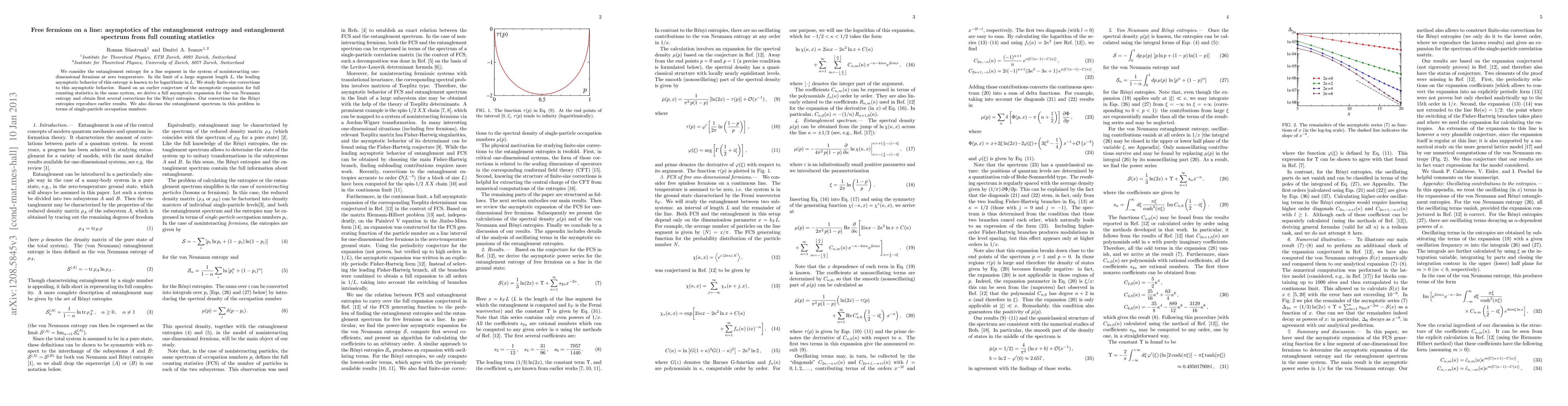 This paper investigates the entanglement entropy for a segment of noninteracting fermions in one dimension, deriving the full asymptotic expansion for the von Neumann entropy and finite-size corrections. It also explores the entanglement spectrum in terms of single-particle occupation numbers, confirming earlier results for Renyi entropies.