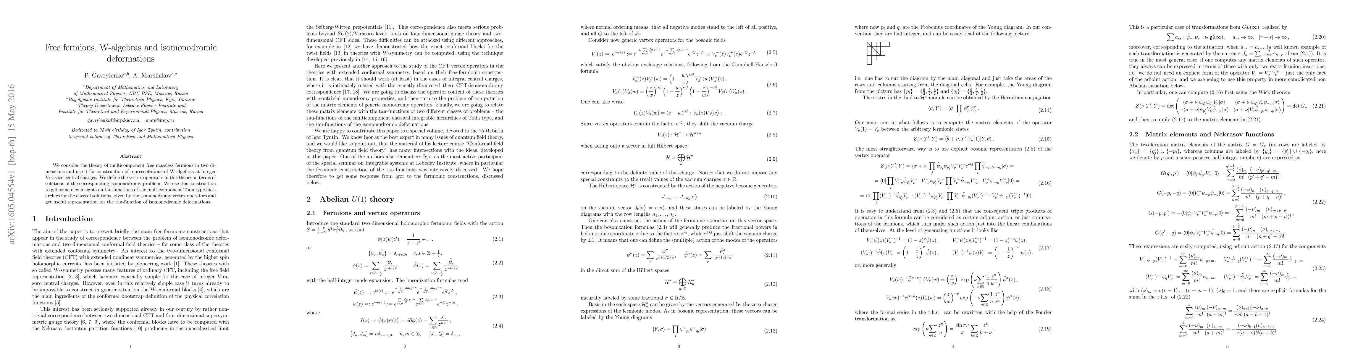 We consider the theory of multicomponent free massless fermions in two dimensions and use it for construction of representations of W-algebras at integer Virasoro central charges. We define the vertex operators in this theory in terms of solutions of the corresponding isomonodromy problem. We use this construction to get some new insights on tau-functions of the multicomponent Toda type hierarchies for the class of solutions, given by the isomonodromy vertex operators and get useful representation for the tau-function of isomonodromic deformations.