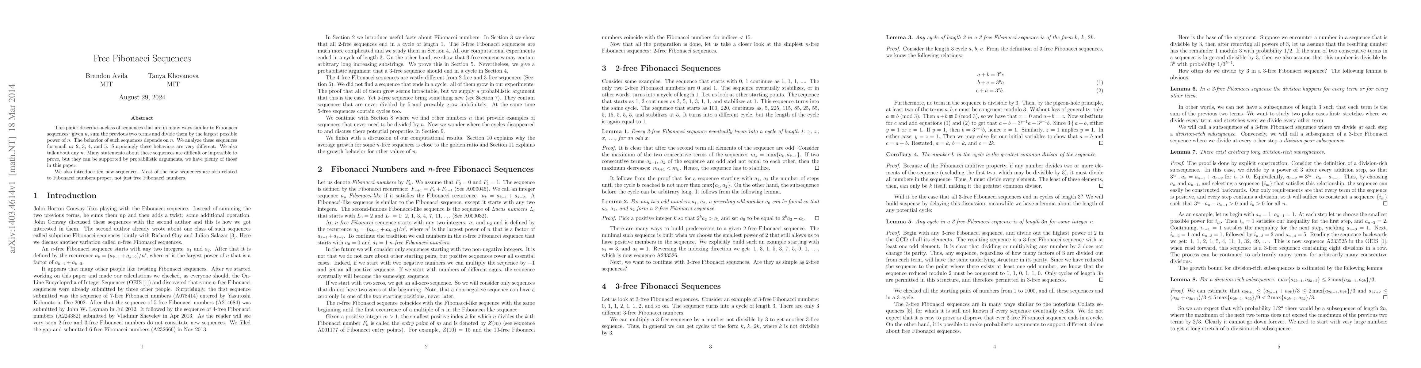 This paper describes a class of sequences that are in many ways similar to Fibonacci sequences: given n, sum the previous two terms and divide them by the largest possible power of n. The behavior of such sequences depends on n. We analyze these sequences for small n: 2, 3, 4, and 5. Surprisingly these behaviors are very different. We also talk about any n. Many statements about these sequences are difficult or impossible to prove, but they can be supported by probabilistic arguments, we have plenty of those in this paper. We also introduce ten new sequences. Most of the new sequences are also related to Fibonacci numbers proper, not just free Fibonacci numbers.