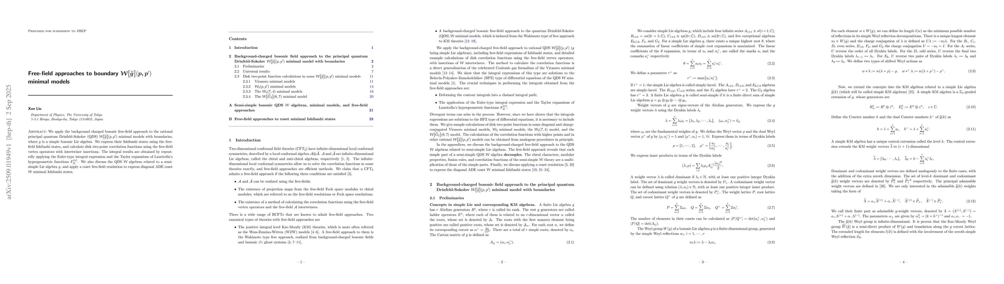 We apply the background charged bosonic free-field approach to the rational principal quantum Drinfeld-Sokolov (QDS) $\mathcal{W} \big[ \widehat{g} \big](p,p')$ minimal models with boundaries, where $g$ is a simple bosonic Lie algebra. We express their Ishibashi states using the free-field Ishibashi states, and calculate disk two-point correlation functions using the free-field vertex operators with intertwiner insertions. The integral results are obtained by repeatedly applying the Euler-type integral expression and the Taylor expansions of Lauricella's hypergeometric functions $F_{D}^{(n)}$. We also discuss the QDS $\mathcal{W} $ algebras related to a semi-simple Lie algebra $g$, and apply a coset free-field resolution to express diagonal ADE coset $\mathcal{W}$ minimal Ishibashi states.