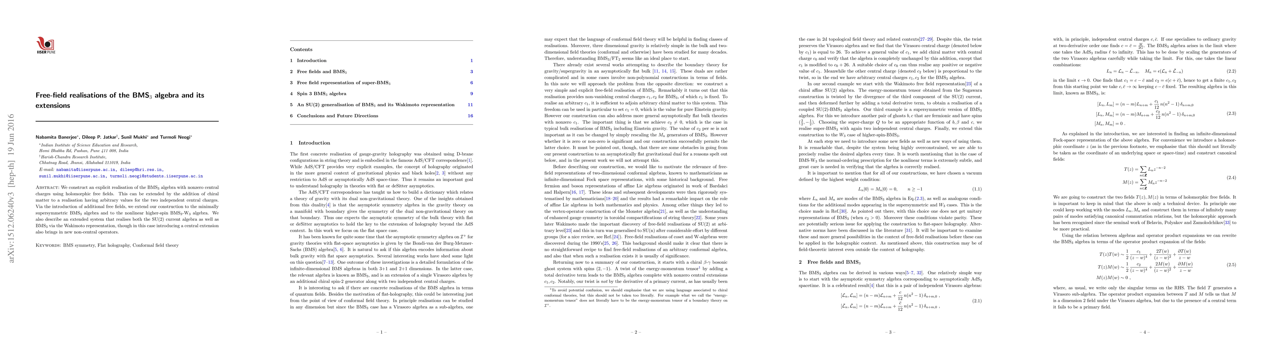 We construct an explicit realisation of the BMS$_3$ algebra with nonzero central charges using holomorphic free fields. This can be extended by the addition of chiral matter to a realisation having arbitrary values for the two independent central charges. Via the introduction of additional free fields, we extend our construction to the minimally supersymmetric BMS$_3$ algebra and to the nonlinear higher-spin BMS$_3$-W$_3$ algebra. We also describe an extended system that realises both the SU(2) current algebra as well as BMS$_3$ via the Wakimoto representation, though in this case introducing a central extension also brings in new non-central operators.
