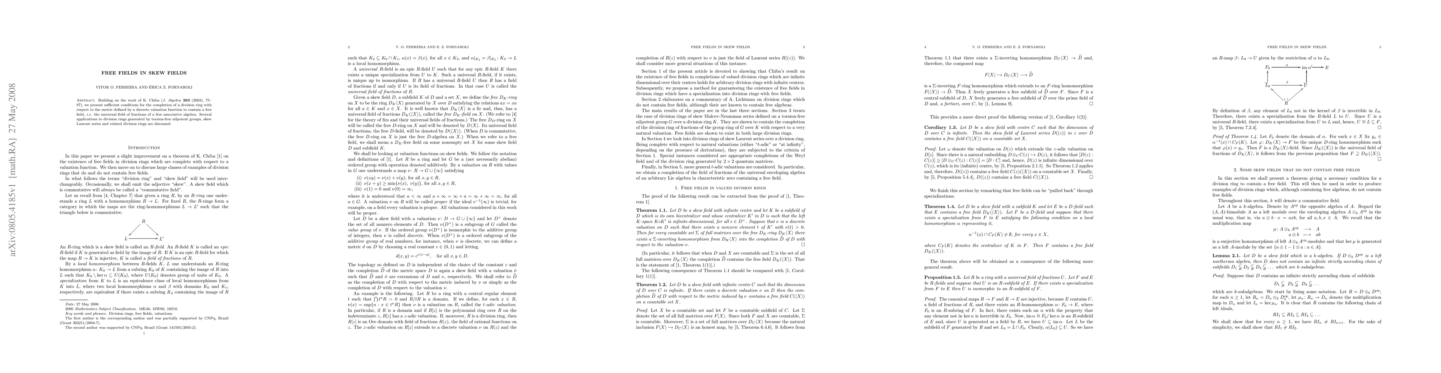 Building on the work of K. Chiba (J. Algebra 263 (2003), 75-87), we present sufficient conditions for the completion of a division ring with respect to the metric defined by a discrete valuation function to contain a free field, i.e. the universal field of fractions of a free associative algebra. Several applications to division rings generated by torsion-free nilpotent groups, skew Laurent series and related division rings are discussed.