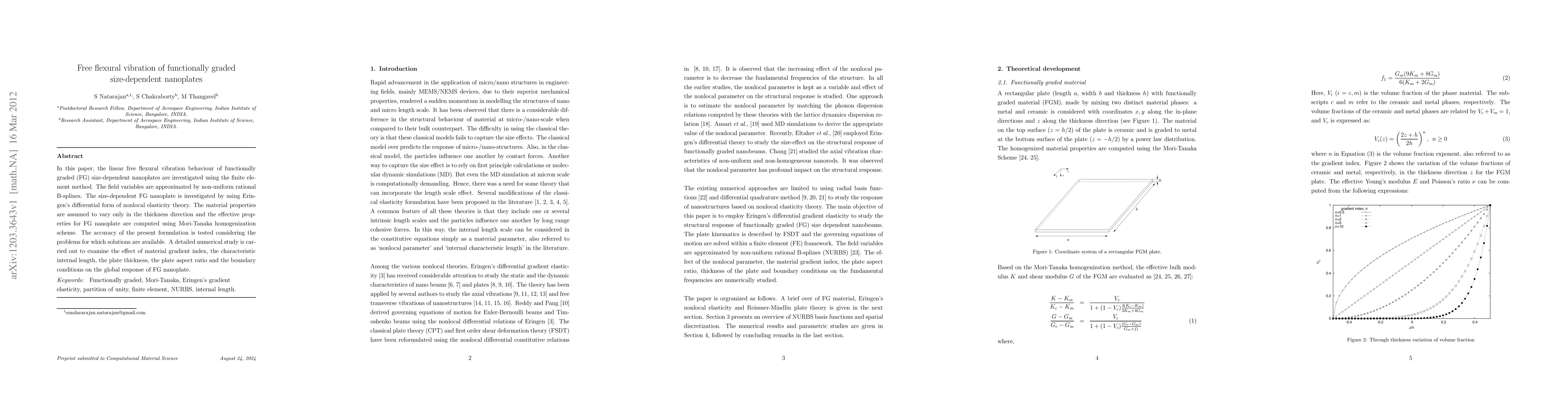 In this paper, the linear free flexural vibration behaviour of functionally graded (FG) size-dependent nanoplates are investigated using the finite element method. The field variables are approximated by non-uniform rational B-splines. The size-dependent FG nanoplate is investigated by using Eringen's differential form of nonlocal elasticity theory. The material properties are assumed to vary only in the thickness direction and the effective properties for FG nanoplate are computed using Mori-Tanaka homogenization scheme. The accuracy of the present formulation is tested considering the problems for which solutions are available. A detailed numerical study is carried out to examine the effect of material gradient index, the characteristic internal length, the plate thickness, the plate aspect ratio and the boundary conditions on the global response of FG nanoplate.