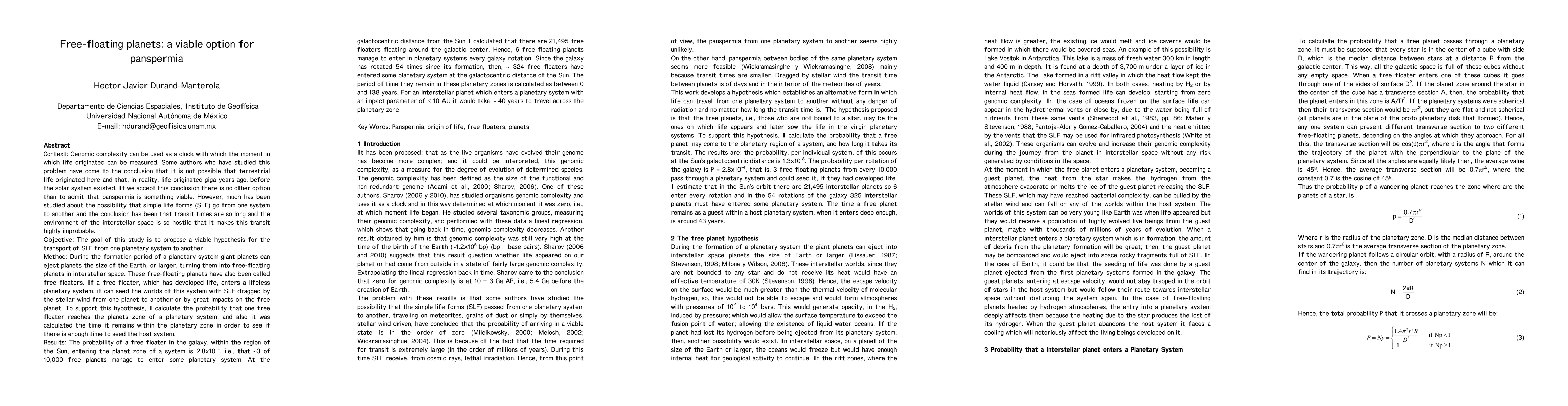 Genomic complexity can be used as a clock with which the moment in which life originated can be measured. Some authors who have studied this problem have come to the conclusion that it is not possible that terrestrial life originated here and that, in reality, life originated giga-years ago, before the solar system existed. If we accept this conclusion there is no other option than to admit that panspermia is something viable.The goal of this study is to propose a viable hypothesis for the transport of SLF from one planetary system to another. During the formation period of a planetary system giant planets can eject planets the size of the Earth, or larger, turning them into free-floating planets in interstellar space. These free-floating planets have also been called free floaters. If a free floater, which has developed life, enters a lifeless planetary system, it can seed the worlds of this system with SLF dragged by the stellar wind from one planet to another or by great impacts on the free planet. To support this hypothesis, I calculate the probability that one free floater reaches the planets zone of a planetary system, and also it was calculated the time it remains within the planetary zone in order to see if there is enough time to seed the host system.The probability of a free floater in the galaxy, within the region of the Sun, entering the planet zone of a system is 2.8x10-4, i.e., that {\sim}3 of 10,000 free planets manage to enter some planetary system. At the galactocentric distance from the Sun I calculated that there are 21,495 free floaters floating around the galactic center. Hence, 6 free-floating planets manage to enter in planetary systems every galaxy rotation. Since the galaxy has rotated 54 times since its formation, then, {\sim} 324 free floaters have entered some planetary system at the galactocentric distance of the Sun.