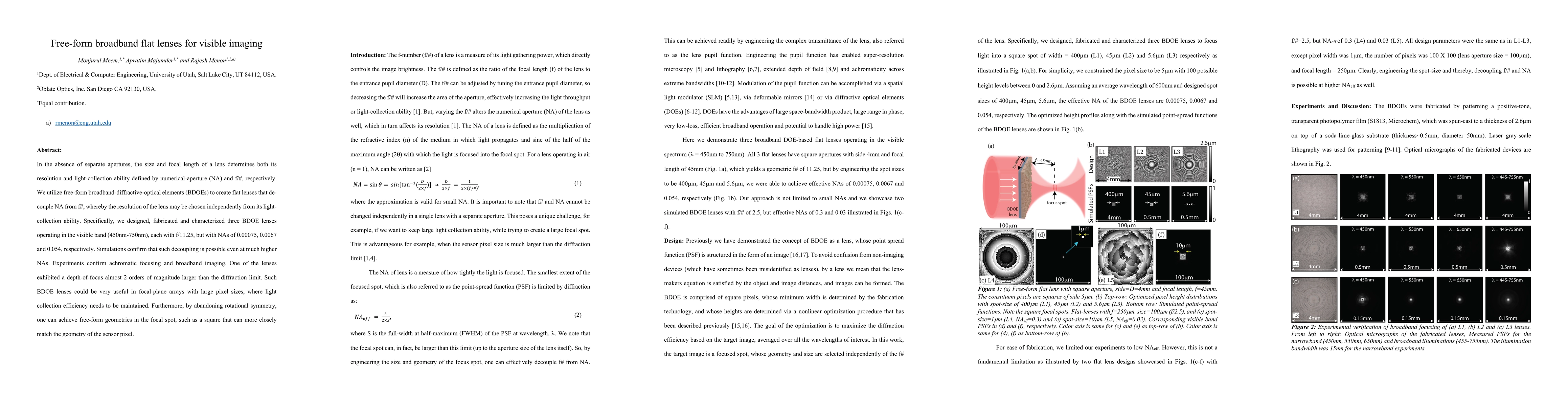 This paper presents free-form broadband-diffractive-optical elements (BDOEs) to create flat lenses that decouple numerical aperture from f/#, enabling independent control over resolution and light-collection ability. Experiments demonstrate achromatic focusing and significant depth-of-focus enhancement, suggesting potential for use in focal-plane arrays with large pixel sizes.