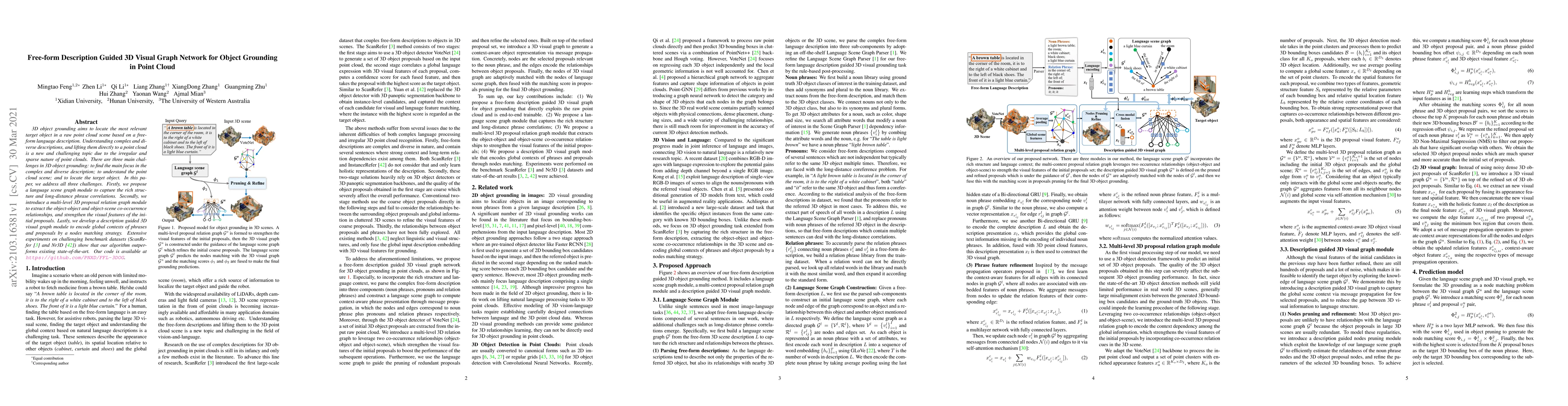 This paper proposes a 3D visual graph network to ground objects in point cloud scenes based on free-form language descriptions. It addresses challenges in understanding complex descriptions, interpreting point clouds, and locating target objects through a language scene graph, multi-level proposal relation graph, and description guided 3D visual graph module. The method outperforms existing approaches on benchmark datasets.