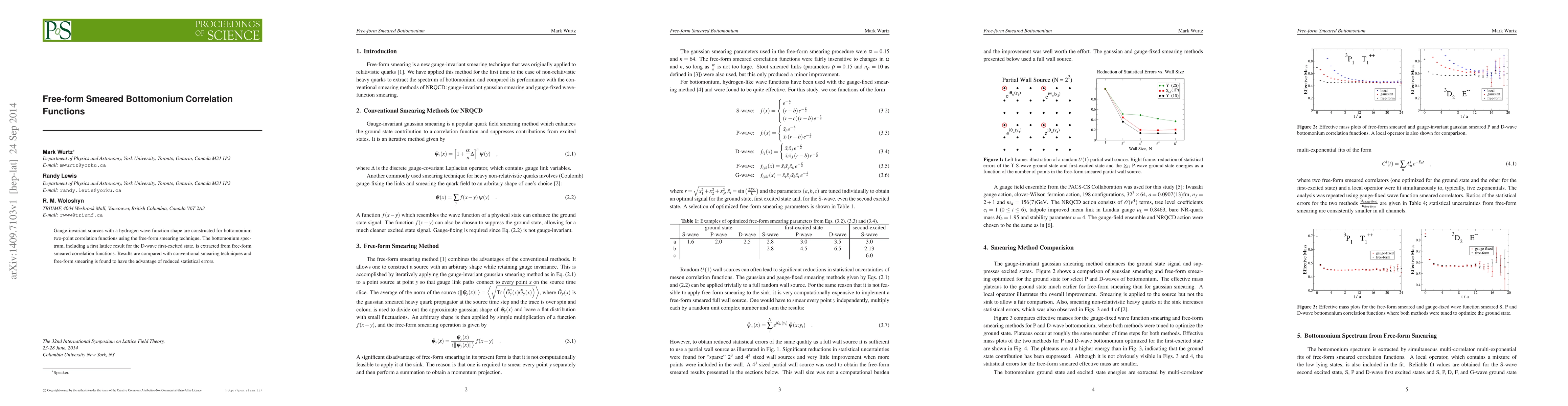 This paper constructs gauge-invariant sources for bottomonium correlation functions using free-form smearing with a hydrogen wave function shape, yielding a first lattice result for the D-wave first-excited state. Free-form smearing is shown to reduce statistical errors compared to conventional techniques.