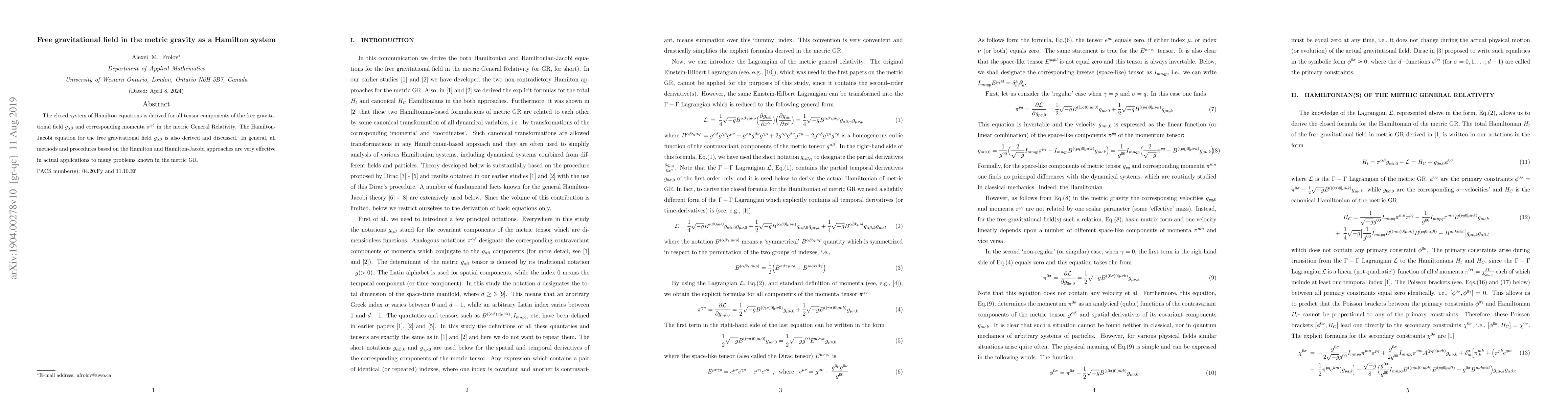 Researchers derived Hamilton equations for free gravitational fields in metric General Relativity, enabling effective solutions to various problems using Hamiltonian and Hamilton-Jacobi approaches.