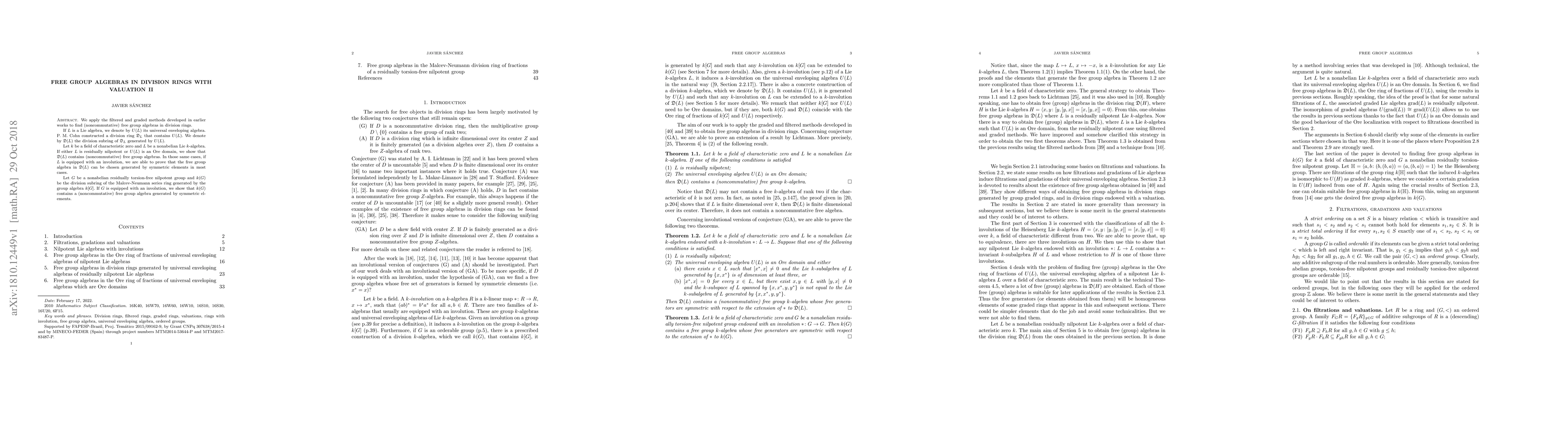 This paper extends previous work on filtered and graded methods to explore noncommutative free group algebras in division rings. It demonstrates that under certain conditions, such as residual nilpotency or the universal enveloping algebra being an Ore domain, these division rings contain free group algebras, often generated by symmetric elements when an involution is present.