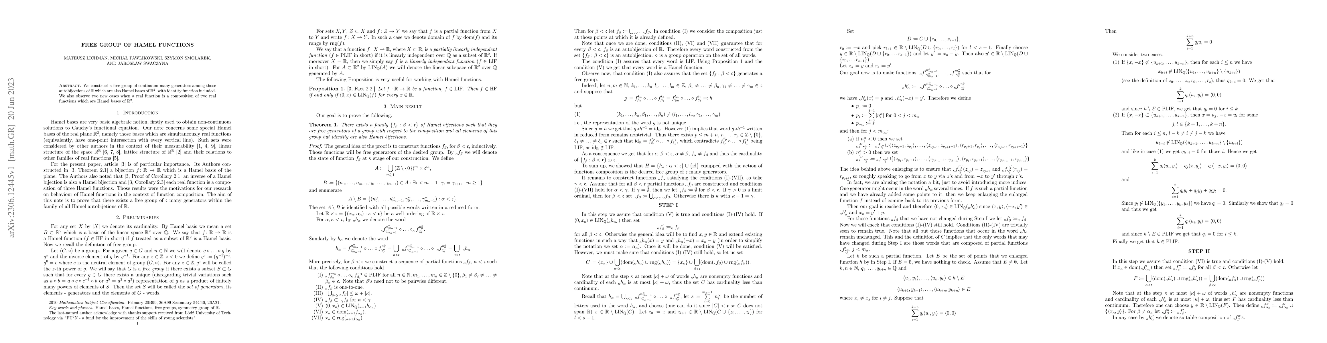 The paper constructs a free group of continuum-sized generators consisting of autobijections of $\mathbb{R}$ that serve as Hamel bases for $\mathbb{R}^2$, including the identity function. Additionally, it identifies two novel instances where a real function can be expressed as a composition of two Hamel basis functions for $\mathbb{R}^2$.