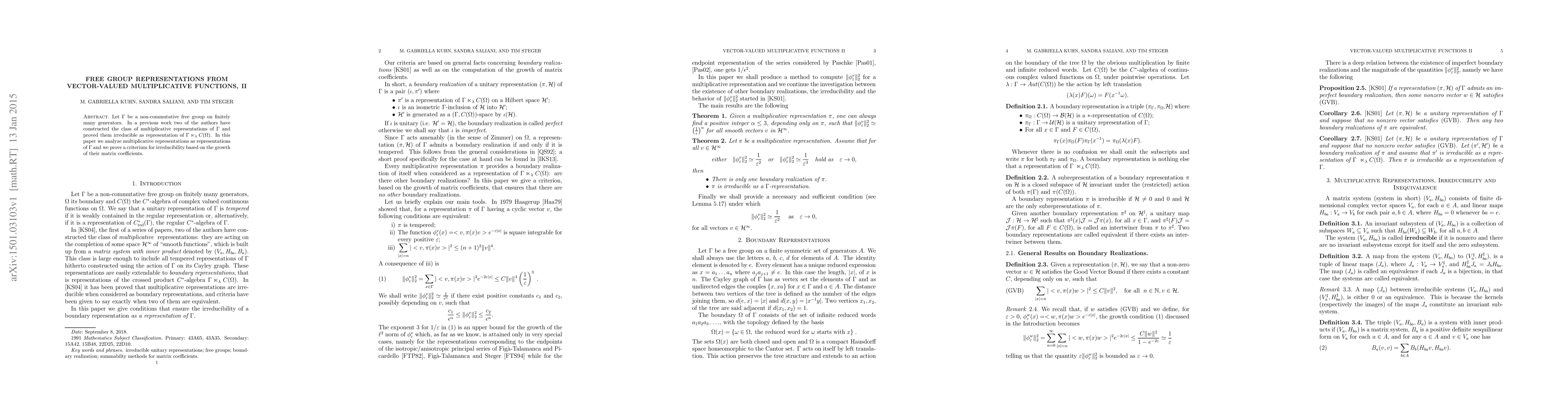 Let $\Gamma$ be a non-commutative free group on finitely many generators. In a previous work two of the authors have constructed the class of multiplicative representations of $\Gamma$ and proved them irreducible as representation of $\Gamma\ltimes_\lambda C(\Omega)$. In this paper we analyze multiplicative representations as representations of $\Gamma$ and we prove a criterium for irreducibility based on the growth of their matrix coefficients.