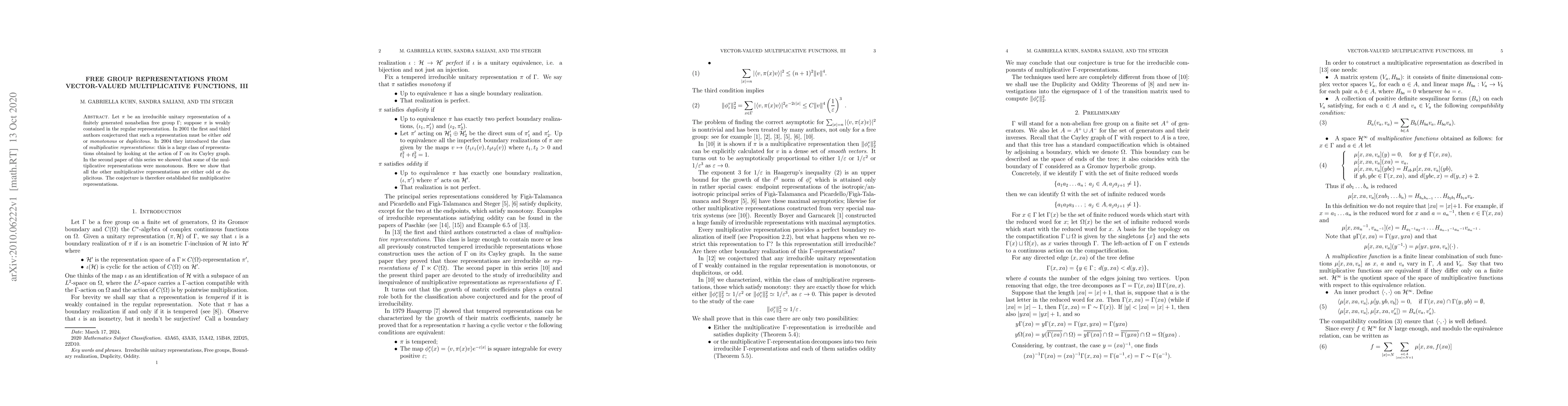 Let $\pi$ be an irreducible unitary representation of a finitely generated nonabelian free group $\Gamma$; suppose $\pi$ is weakly contained in the regular representation. In 2001 the first and third authors conjectured that such a representation must be either odd or monotonous or duplicitous. In 2004 they introduced the class of multiplicative representations: this is a large class of representations obtained by looking at the action of $\Gamma$ on its Cayley graph. In the second paper of this series we showed that some of the multiplicative representations were monotonous. Here we show that all the other multiplicative representations are either odd or duplicitous. The conjecture is therefore established for multiplicative representations.