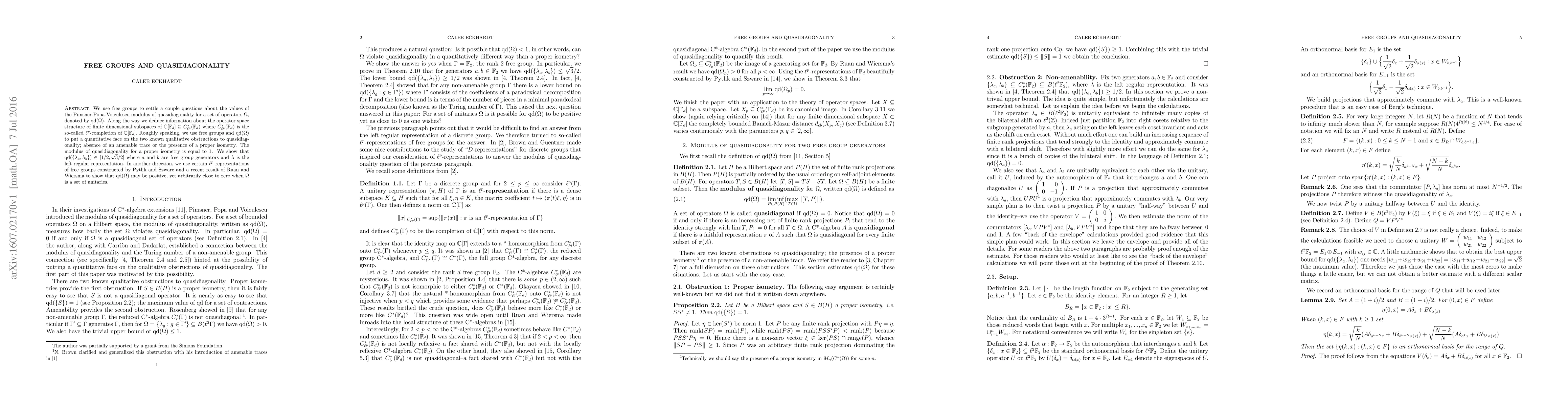 We use free groups to settle a couple questions about the values of the Pimsner-Popa-Voiculescu modulus of quasidiagonality for a set of operators $\Omega$, denoted by qd$(\Omega)$. Along the way we deduce information about the operator space structure of finite dimensional subspaces of $\mathbb{C}[\mathbb{F}_d]\subseteq C^*_{\ell^p}(\mathbb{F}_d)$ where $C^*_{\ell^p}(\mathbb{F}_d)$ is the so-called $\ell^p$-completion of $\mathbb{C}[\mathbb{F}_d].$ Roughly speaking, we use free groups and qd$(\Omega)$ to put a quantitative face on the two known qualitative obstructions to quasidiagonality; absence of an amenable trace or the presence of a proper isometry. The modulus of quasidiagonality for a proper isometry is equal to 1. We show that qd$(\{\lambda_a,\lambda_b\})\in [1/2,\sqrt{3}/2]$ where $a$ and $b$ are free group generators and $\lambda$ is the left regular representation. In another direction, we use certain $\ell^p$ representations of free groups constructed by Pytlik and Szwarc and a recent result of Ruan and Wiersma to show that qd$(\Omega)$ may be positive, yet arbitrarily close to zero when $\Omega$ is a set of unitaries.