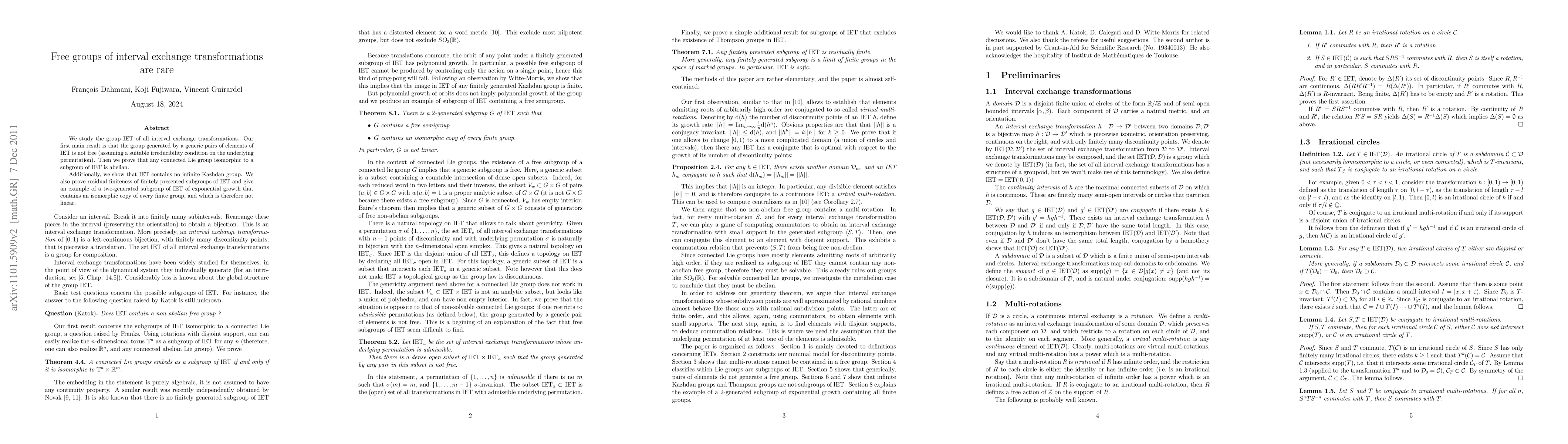 The paper finds that free groups of interval exchange transformations are rare, and instead shows that connected Lie groups isomorphic to a subgroup of IET are abelian, while also proving residual finiteness of finitely presented subgroups.