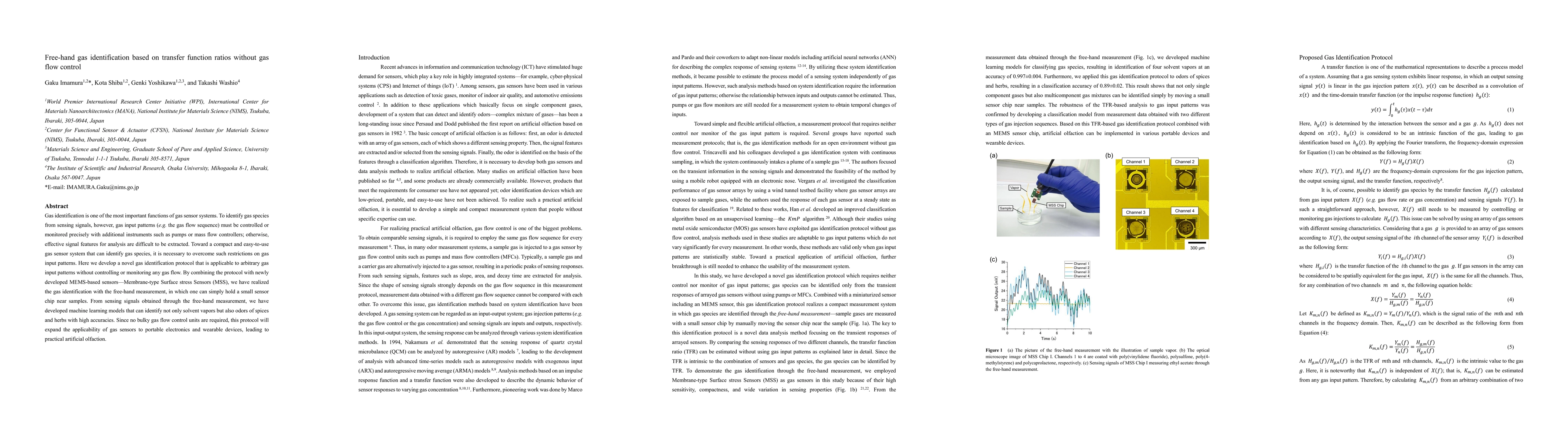 Gas identification is one of the most important functions of gas sensor systems. To identify gas species from sensing signals, however, gas input patterns (e.g. the gas flow sequence) must be controlled or monitored precisely with additional instruments such as pumps or mass flow controllers; otherwise, effective signal features for analysis are difficult to be extracted. Toward a compact and easy-to-use gas sensor system that can identify gas species, it is necessary to overcome such restrictions on gas input patterns. Here we develop a novel gas identification protocol that is applicable to arbitrary gas input patterns without controlling or monitoring any gas flow. By combining the protocol with newly developed MEMS-based sensors (i.e. Membrane-type Surface stress Sensors (MSS)), we have realized the gas identification with the free-hand measurement, in which one can simply hold a small sensor chip near samples. From sensing signals obtained through the free-hand measurement, we have developed machine learning models that can identify not only solvent vapors but also odors of spices and herbs with high accuracies. Since no bulky gas flow control units are required, this protocol will expand the applicability of gas sensors to portable electronics and wearable devices, leading to practical artificial olfaction.
