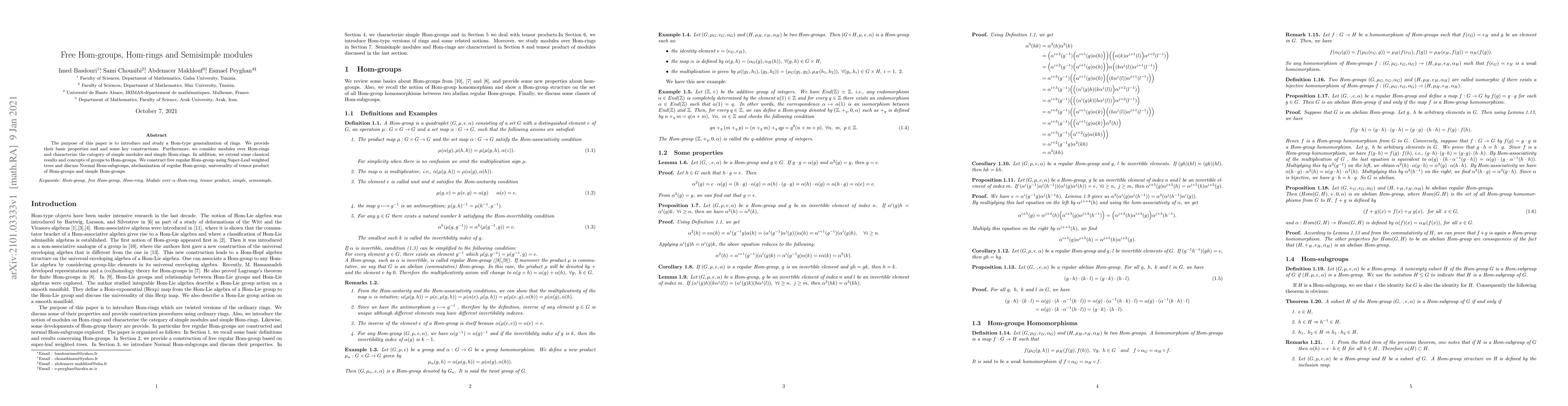 The purpose of this paper is to introduce and study a Hom-type generalization of rings. We provide their basic properties and and some key constructions. Furthermore, we consider modules over Hom-rings and characterize the category of simple modules and simple Hom-rings. In addition, we extend some classical results and concepts of groups to Hom-groups. We construct free regular Hom-group using Super-Leaf weighted trees and discuss Normal Hom-subgroups, abelianization of regular Hom-group, universality of tensor product of Hom-groups and simple Hom-groups.