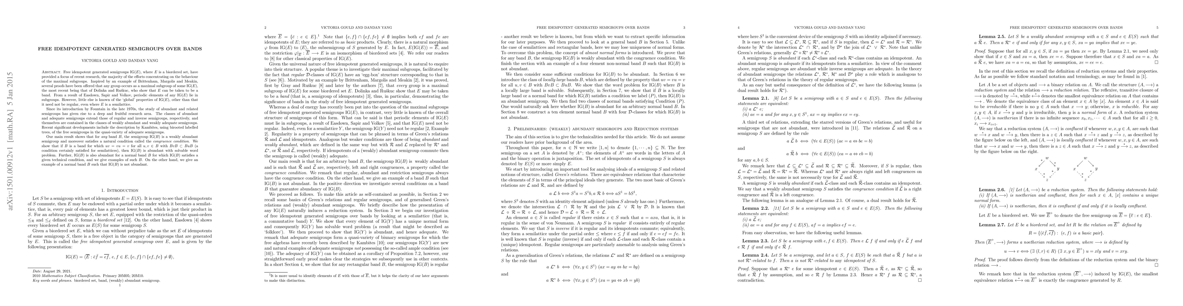 Free idempotent generated semigroups IG$(E)$, where $E$ is a biordered set, have provided a focus of recent research, the majority of the efforts concentrating on the behaviour of the maximal subgroups. Inspired by an example of Brittenham, Margolis and Meakin, several proofs have been offered that any group occurs as a maximal subgroup of some IG$(E)$, the most recent being that of Dolinka and Ru\v{s}kuc, who show that $E$ can be taken to be a band. From a result of Easdown, Sapir and Volkov, periodic elements of any IG$(E)$ lie in subgroups. However, little else is known of the `global' properties of IG$(E)$, other than that it need not be regular, even where $E$ is a semilattice. Since its introduction by Fountain in the late 1970s, the study of abundant and related semigroups has given rise to a deep and fruitful research area. The classes of abundant and adequate semigroups extend those of regular and inverse semigroups, respectively, and themselves are contained in the classes of weakly abundant and weakly adequate semigroups. Recent significant developments include the description by Kambites, using birooted labelled trees, of the free semigroups in the quasi-variety of adequate semigroups. Our main result shows that for any band $B$, the semigroup IG$(B)$ is a weakly abundant semigroup and moreover satisfies a natural condition called the congruence condition. We show that if $B$ is a band for which $uv=vu=v$ for all $u,v\in B$ with $BvB\subset BuB$ (a condition certainly satisfied for semilattices), then IG$(B)$ is abundant with solvable word problem. Further, IG$(B)$ is also abundant for a normal band $B$ for which IG$(B)$ satisfies a given technical condition, and we give examples of such $B$. On the other hand, we give an example of a normal band $B$ such that IG$(B)$ is not abundant.