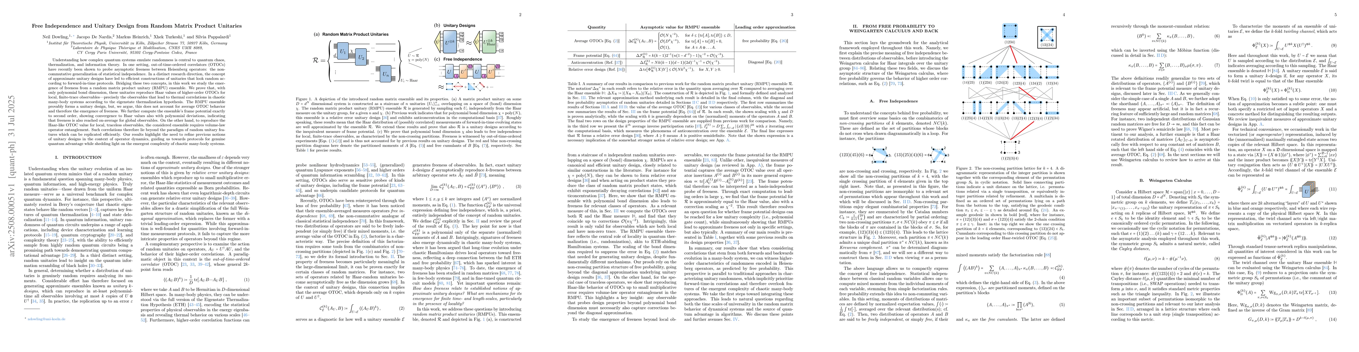 Understanding how complex quantum systems emulate randomness is central to quantum chaos, thermalization, and information theory. In one setting, out-of-time-ordered correlators (OTOCs) have recently been shown to probe asymptotic freeness between Heisenberg operators: the non-commutative generalization of statistical independence. In a distinct research direction, the concept of approximate unitary designs have led to efficient constructions of unitaries that look random according to forward-in-time protocols. Bridging these two concepts, in this work we study the emergence of freeness from a random matrix product unitary (RMPU) ensemble. We prove that, with only polynomial bond dimension, these unitaries reproduce Haar values of higher-order OTOCs for local, finite-trace observables -- precisely the observables that lead to thermal correlations in chaotic many-body systems according to the eigenstate thermalization hypothesis. The RMPU ensemble provably forms a unitary design, but, we argue, this does not account for average OTOC behavior and therefore the emergence of freeness. We further compute the ensemble's frame potential exactly to second order, showing convergence to Haar values also with polynomial deviations, indicating that freeness is also reached on-average for global observables. On the other hand, to reproduce the Haar-like OTOC value for local, traceless observables, the considered ensemble requires volume-law operator entanglement. Such correlations therefore lie beyond the paradigm of random unitary features which can be replicated efficiently. Our results highlight the need to refine previous notions of unitary designs in the context of operator dynamics, guiding us towards protocols for genuine quantum advantage while shedding light on the emergent complexity of chaotic many-body systems.