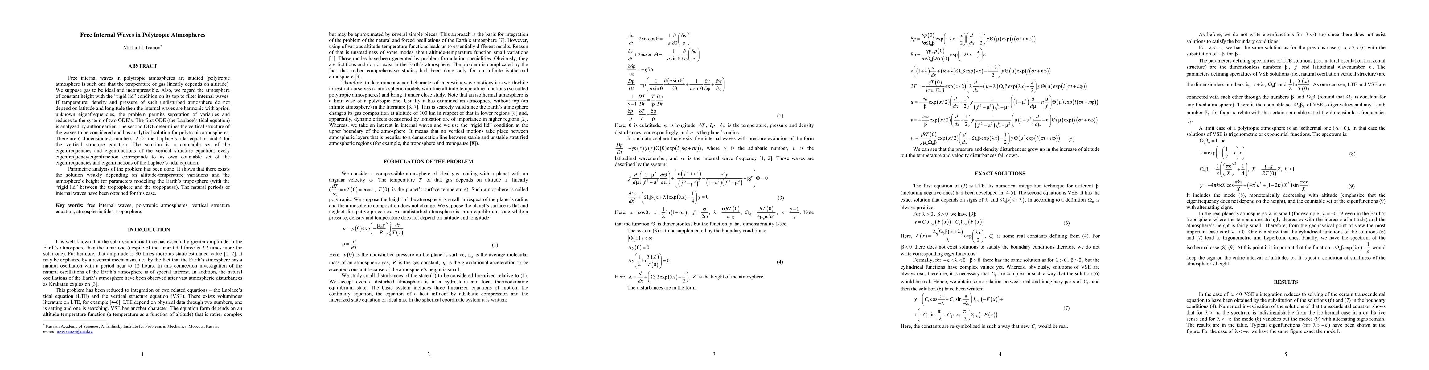 This paper investigates free internal waves in polytropic atmospheres, where temperature linearly depends on altitude, under ideal and incompressible gas conditions. The study derives analytical solutions for eigenfrequencies and eigenfunctions of internal waves, revealing a parametric dependence on altitude-temperature variations and atmospheric height, particularly relevant for the Earth's troposphere.