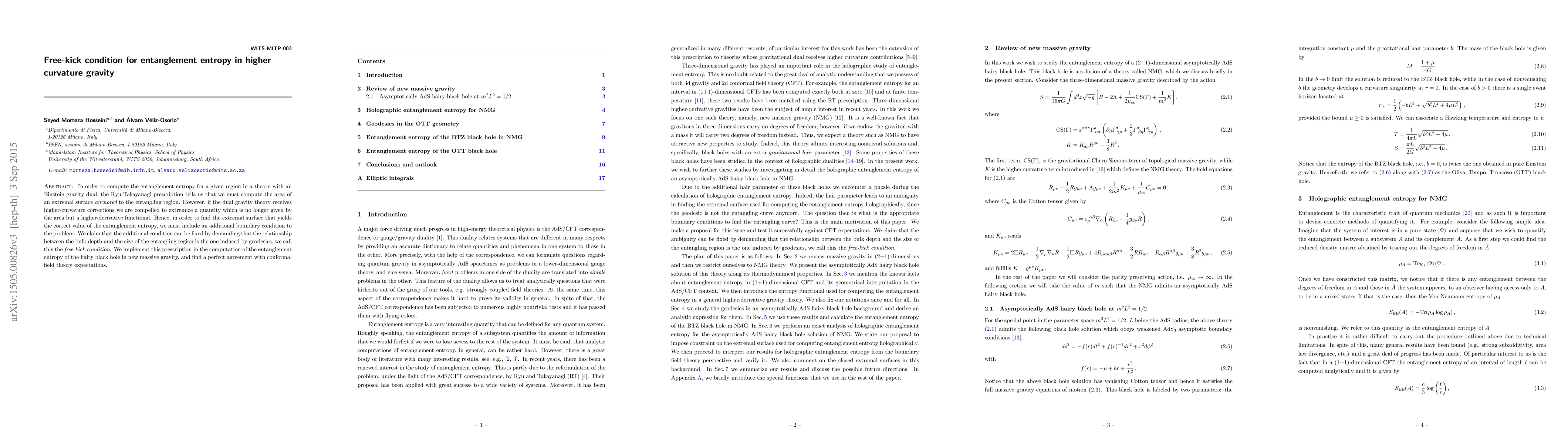 In order to compute the entanglement entropy for a given region in a theory with an Einstein gravity dual, the Ryu-Takayanagi prescription tells us that we must compute the the area of an extremal surface anchored to the entangling region. However, if the dual gravity theory receives higher-curvature corrections we are compelled to extremize a quantity which is no longer given by the area but a higher-derivative functional. Hence, in order to find the extremal surface that yields the correct value of the entanglement entropy, we must include an additional boundary condition to the problem. We claim that the additional condition can be fixed by demanding that the relationship between the bulk depth and the size of the entangling region is the one induced by geodesics, we call this the free-kick condition. We implement this prescription in the computation of the entanglement entropy of the hairy black hole in new massive gravity, and find a perfect agreement with conformal field theory expectations.