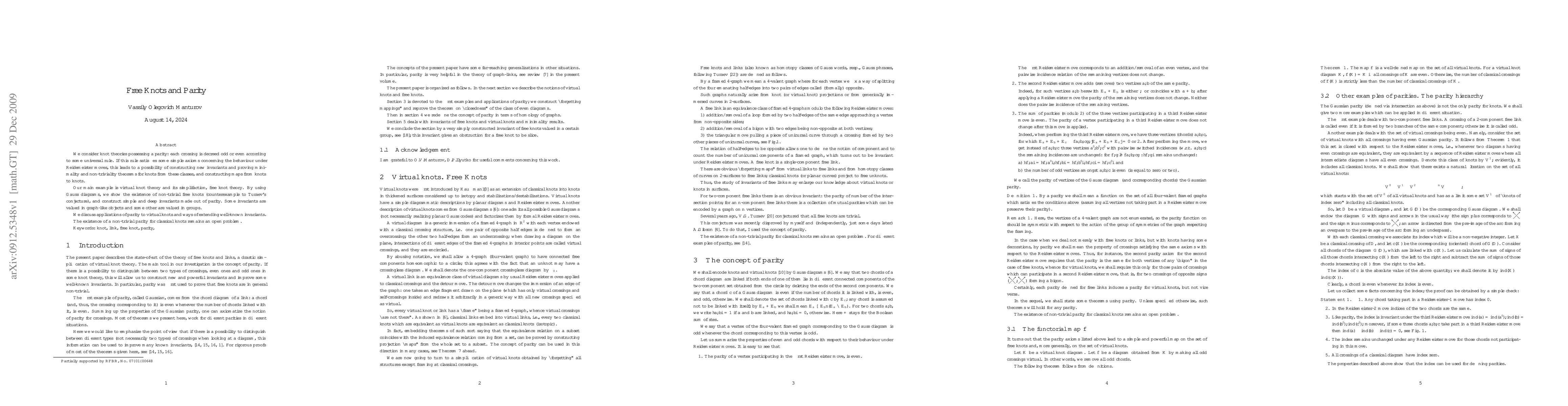 We consider knot theories possessing a {\em parity}: each crossing is decreed {\em odd} or {\em even} according to some universal rule. If this rule satisfies some simple axioms concerning the behaviour under Reidemeister moves, this leads to a possibility of constructing new invariants and proving minimality and non-triviality theorems for knots from these classes, and constructing maps from knots to knots. Our main example is virtual knot theory and its simplifaction, {\em free knot theory}. By using Gauss diagrams, we show the existence of non-trivial free knots (counterexample to Turaev's conjecture), and construct simple and deep invariants made out of parity. Some invariants are valued in graph-like objects and some other are valued in groups. We discuss applications of parity to virtual knots and ways of extending well-known invariants. The existence of a non-trivial parity for classical knots remains an open problem.