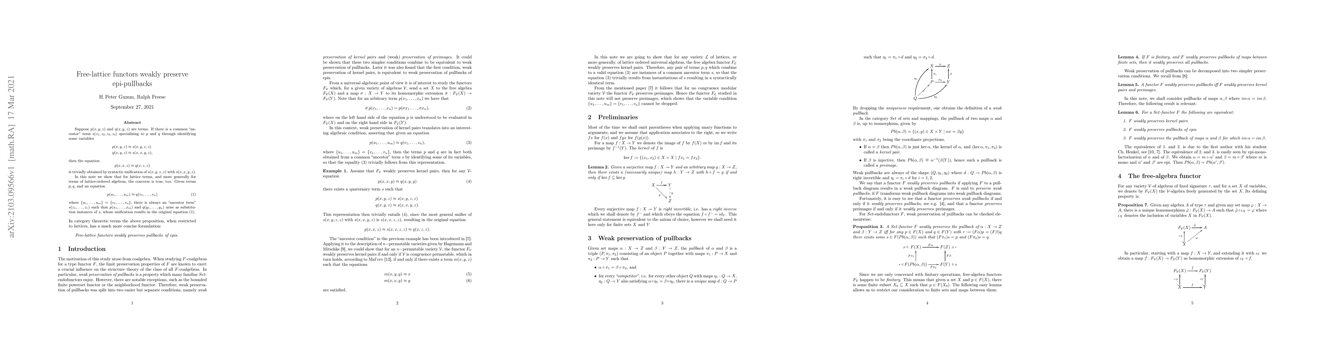 Suppose $p(x,y,z)$ and $q(x,y,z)$ are terms. If there is a common "ancestor" term $s(z_{1},z_{2},z_{3},z_{4})$ specializing to $p$ and $q$ through identifying some variables \begin{align*} p(x,y,z) & \approx s(x,y,z,z)\\ q(x,y,z) & \approx s(x,x,y,z), \end{align*} then the equation \[ p(x,x,z)\approx q(x,z,z) \] is trivially obtained by syntactic unification of $s(x,y,z,z)$ with $s(x,x,y,z).$ In this note we show that for lattice terms, and more generally for terms of lattice-ordered algebras, the converse is true, too. Given terms $p,q,$ and an equation \begin{equation} p(u_{1},\ldots,u_{m})\approx q(v_{1},\ldots,v_{n})\label{eq:p_eq_q} \end{equation} where $\{u_{1},\ldots,u_{m}\}=\{v_{1},\ldots,v_{n}\},$ there is always an "ancestor term" $s(z_{1},\ldots,z_{r})$ such that $p(x_{1},\ldots,x_{m})$ and $q(y_{1},\ldots,y_{n})$ arise as substitution instances of $s,$ whose unification results in the original equation. In category theoretic terms the above proposition, when restricted to lattices, has a much more concise formulation: Free-lattice functors weakly preserves pullbacks of epis.