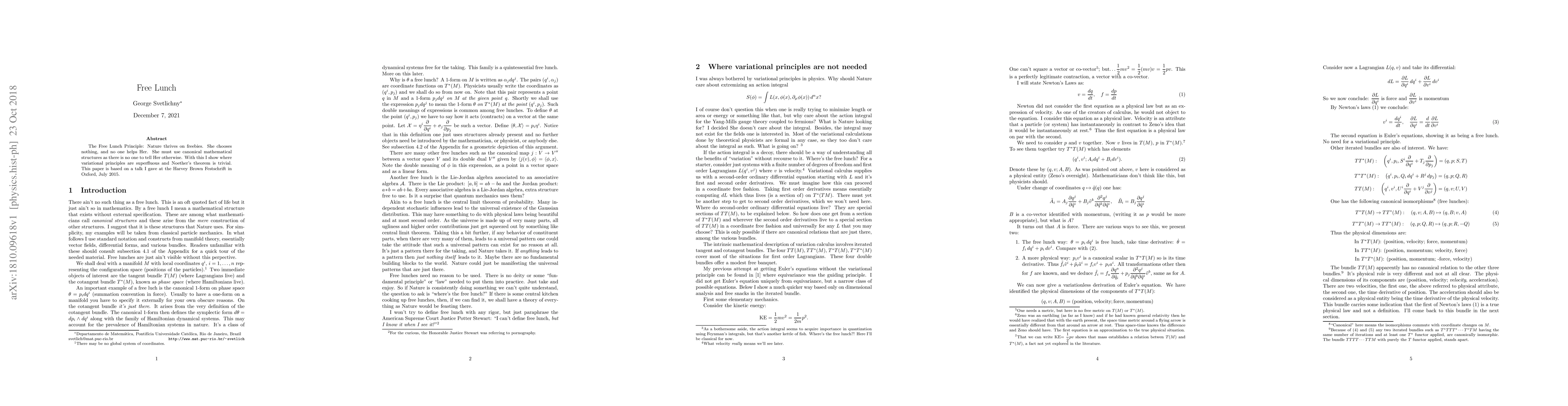The Free Lunch Principle: Nature thrives on freebies. She chooses nothing, and no one helps Her. She must use canonical mathematical structures as there is no one to tell Her otherwise. With this I show where variational principles are superfluous and Noether's theorem is trivial.