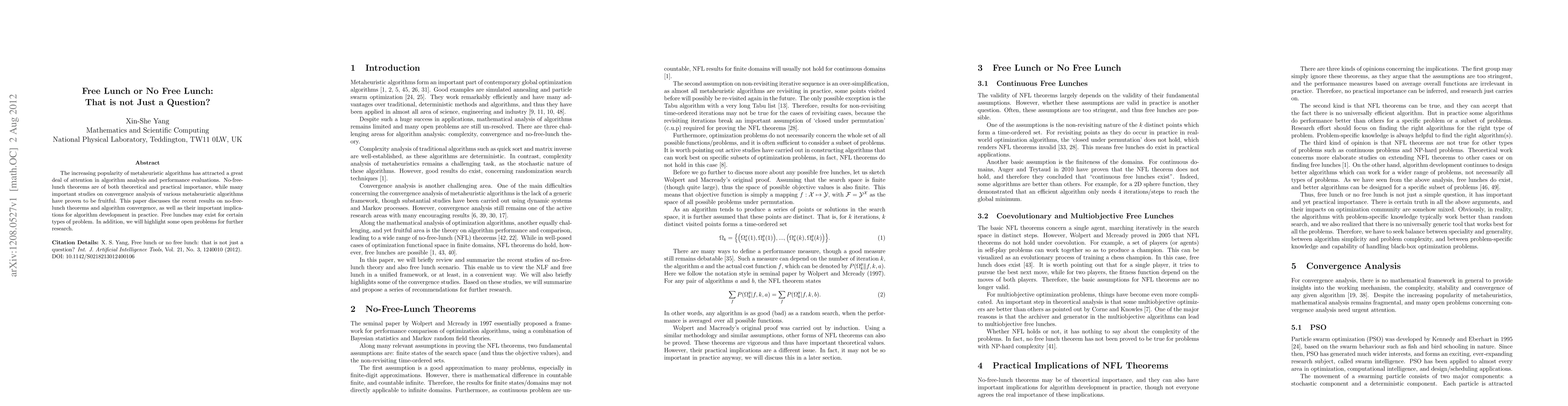 The increasing popularity of metaheuristic algorithms has attracted a great deal of attention in algorithm analysis and performance evaluations. No-free-lunch theorems are of both theoretical and practical importance, while many important studies on convergence analysis of various metaheuristic algorithms have proven to be fruitful. This paper discusses the recent results on no-free-lunch theorems and algorithm convergence, as well as their important implications for algorithm development in practice. Free lunches may exist for certain types of problem. In addition, we will highlight some open problems for further research.