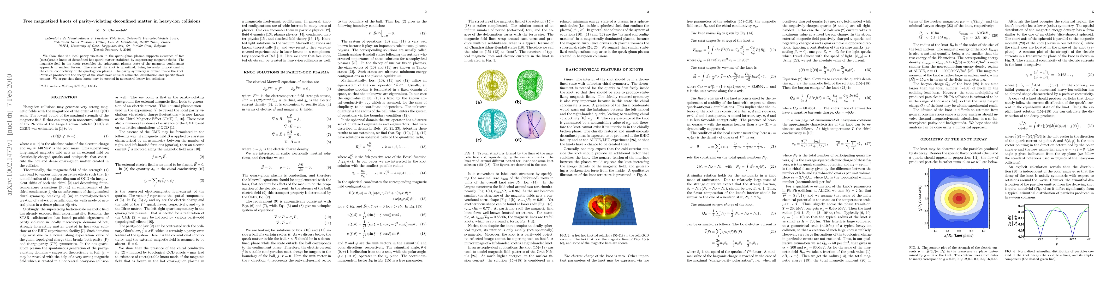 This research demonstrates that local parity violation in quark-gluon plasma can form free, metastable knots of deconfined quark matter stabilized by superstrong magnetic fields, with quantized size inversely proportional to the chiral conductivity. These knots may be produced in noncentral heavy-ion collisions and exhibit unique particle decay patterns.