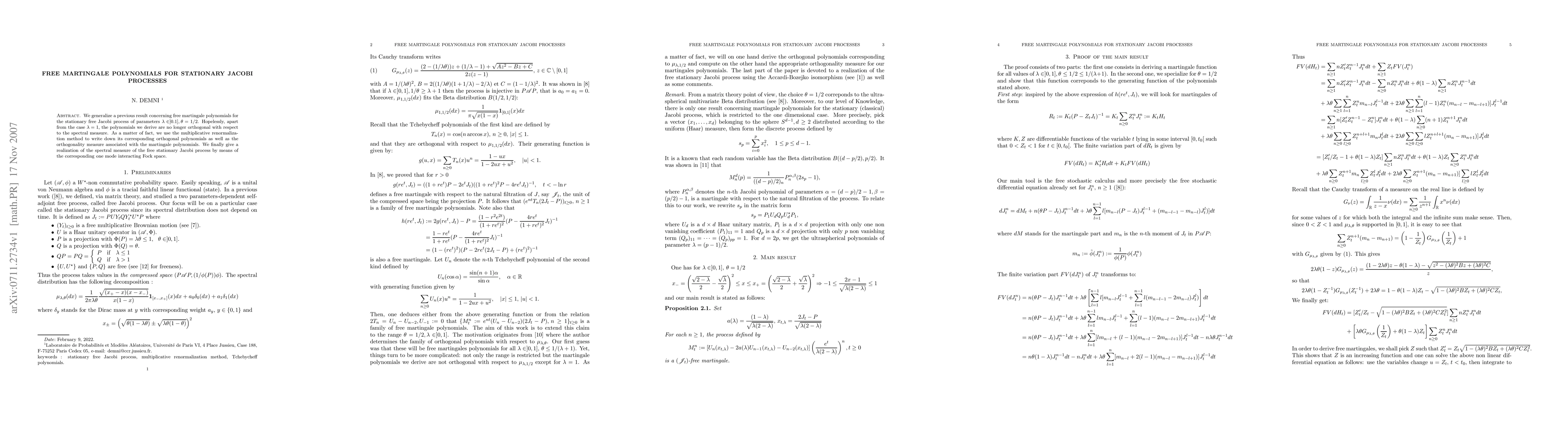We generalize a previous result concerning free martingale polynomials for the stationary free Jacobi process of parameters $\lambda \in ]0.1], \theta = 1/2$. Hopelessly, apart from the case $\lambda = 1$, the polynomials we derive are no longer orthogonal with respect to the spectral measure. As a matter of fact, we use the multiplicative renormalization to write down the corresponding orthogonality measure.