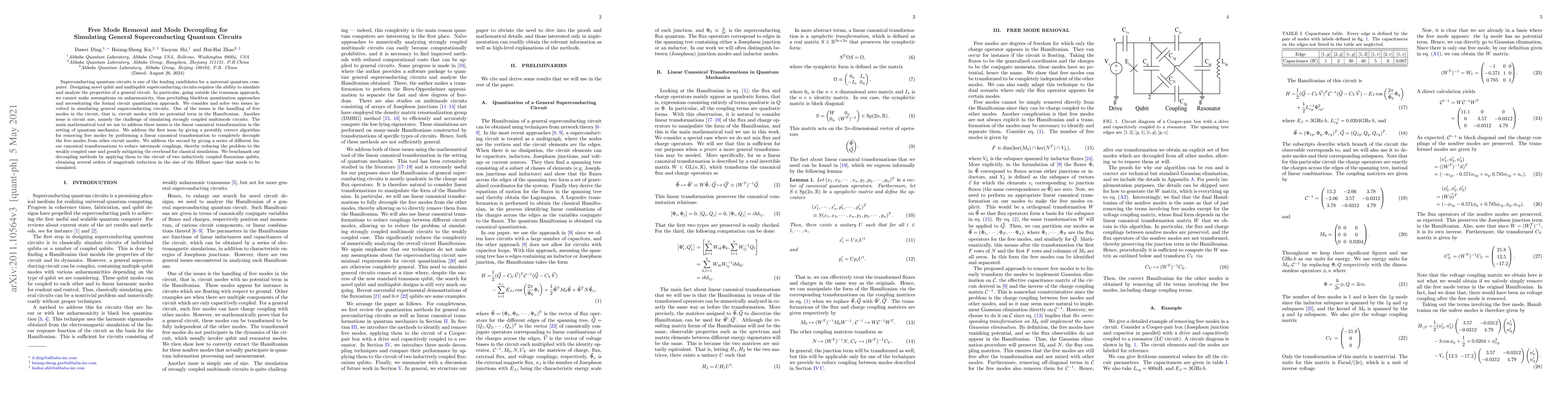 This paper presents methods for simulating general superconducting quantum circuits by addressing free mode removal and mode decoupling. It employs linear canonical transformations to eliminate free modes and reduce intermode couplings, significantly lowering the simulation complexity and Hilbert space size, as demonstrated with coupled fluxonium qubits.