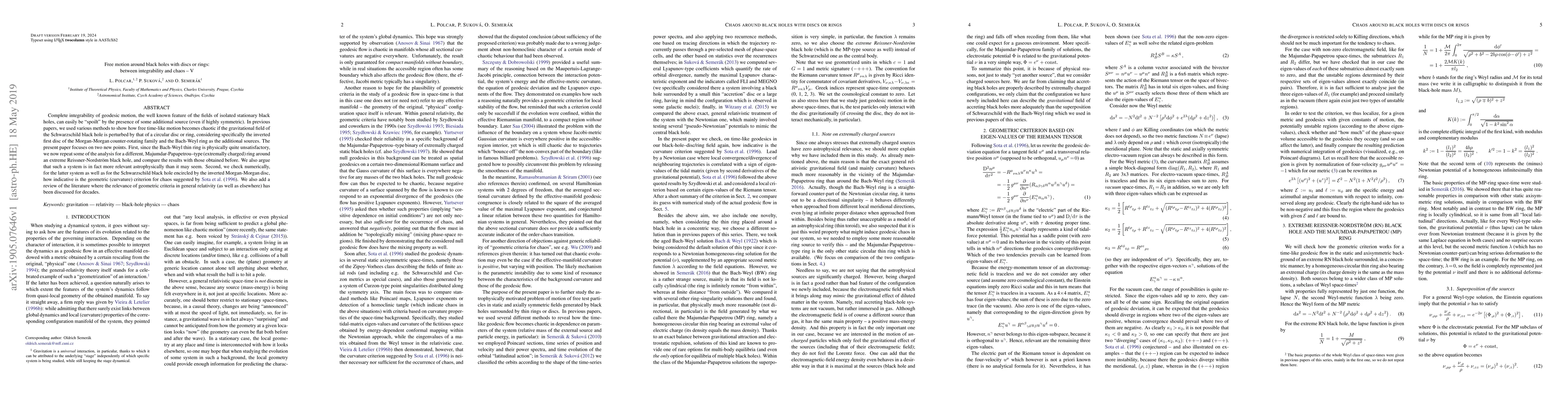 Complete integrability of geodesic motion, the well known feature of the fields of isolated stationary black holes, can easily be "spoilt" by the presence of some additional source (even if highly symmetric). In previous papers, we used various methods to show how free time-like motion becomes chaotic if the gravitational field of the Schwarzschild black hole is perturbed by that of a circular disc or ring, considering specifically the inverted first disc of the Morgan-Morgan counter-rotating family and the Bach-Weyl ring as the additional sources. The present paper focuses on two new points. First, since the Bach-Weyl thin ring is physically quite unsatisfactory, we now repeat some of the analysis for a different, Majumdar-Papapetrou--type (extremally charged) ring around an extreme Reissner-Nordstr\"om black hole, and compare the results with those obtained before. We also argue that such a system is in fact more relevant astrophysically than it may seem. Second, we check numerically, for the latter system as well as for the Schwarzschild black hole encircled by the inverted Morgan-Morgan disc, how indicative is the geometric (curvature) criterion for chaos suggested by Sota, Suzuki & Maeda (1996). We also add a review of the literature where the relevance of geometric criteria in general relativity (as well as elsewhere) has been discussed for decades.