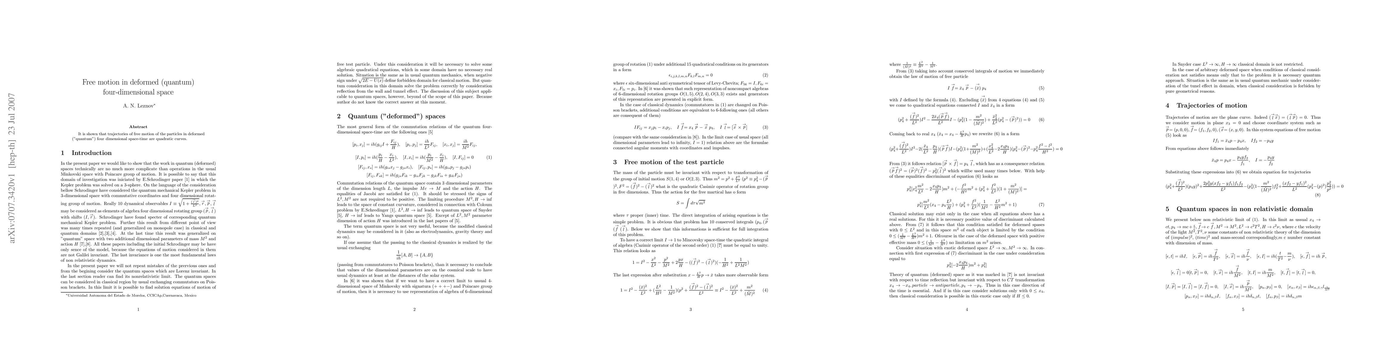 Summary: The paper demonstrates that particles in deformed ("quantum") four-dimensional space-time exhibit free motion along quadratic curves, highlighting the unique characteristics of quantum space-time.