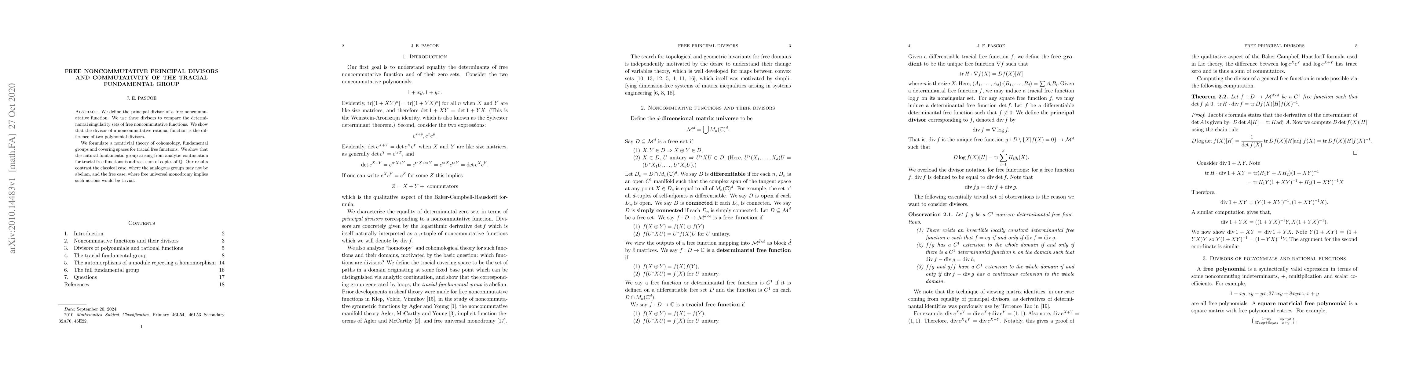 This paper introduces free noncommutative principal divisors and demonstrates their use in comparing determinantal singularity sets of free noncommutative functions. It further develops a theory of cohomology, fundamental groups, and covering spaces for tracial free functions, showing that their natural fundamental group is a direct sum of copies of $\mathbb{Q}$, contrasting with classical noncommutative and free cases.