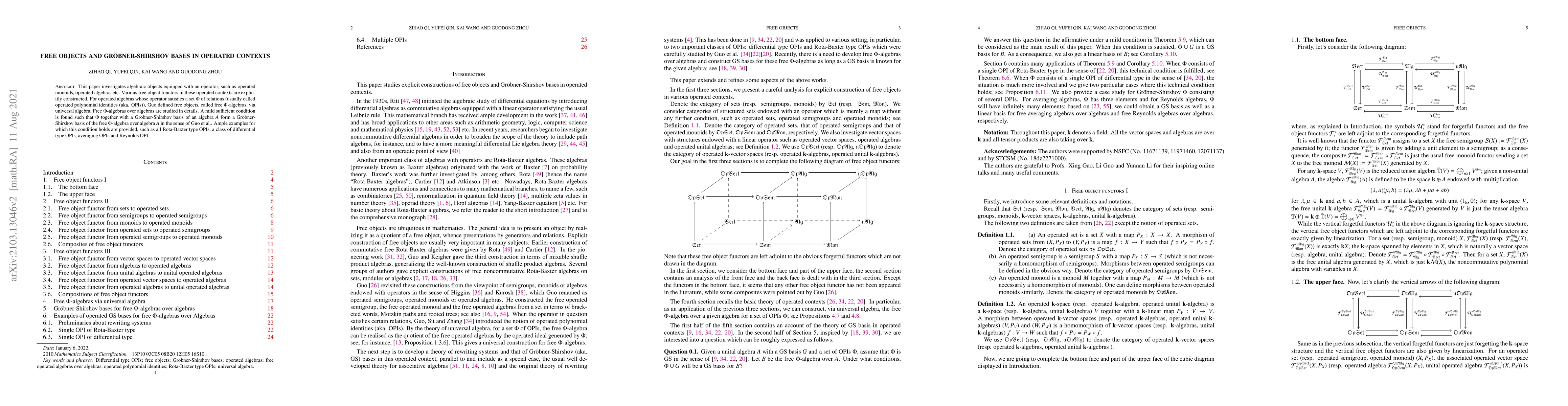 This paper investigates algebraic objects equipped with an operator, such as operated monoids, operated algebras etc. Various free object functors in these operated contexts are explicitly constructed. For operated algebras whose operator satisfies a set $\Phi$ of relations (usually called operated polynomial identities (aka. OPIs)), Guo defined free objects, called free $\Phi$-algebras, via universal algebra. Free $\Phi$-algebras over algebras are studied in details. A mild sufficient condition is found such that $\Phi$ together with a Gr\"obner-Shirshov basis of an algebra $A$ form a Gr\"obner-Shirshov basis of the free $\Phi$-algebra over algebra $A$ in the sense of Guo et al.. Ample examples for which this condition holds are provided, such as all Rota-Baxter type OPIs, a class of differential type OPIs, averaging OPIs and Reynolds OPI.